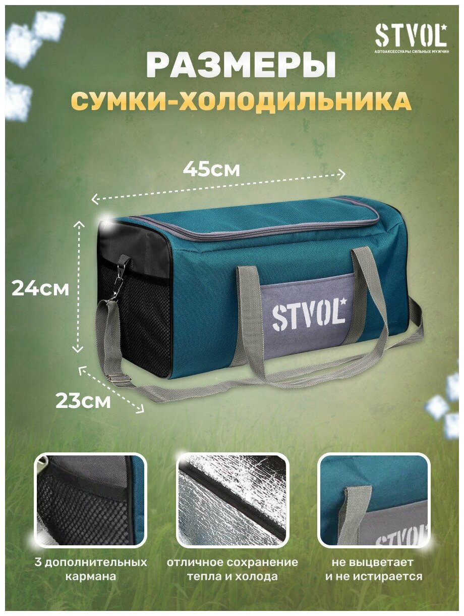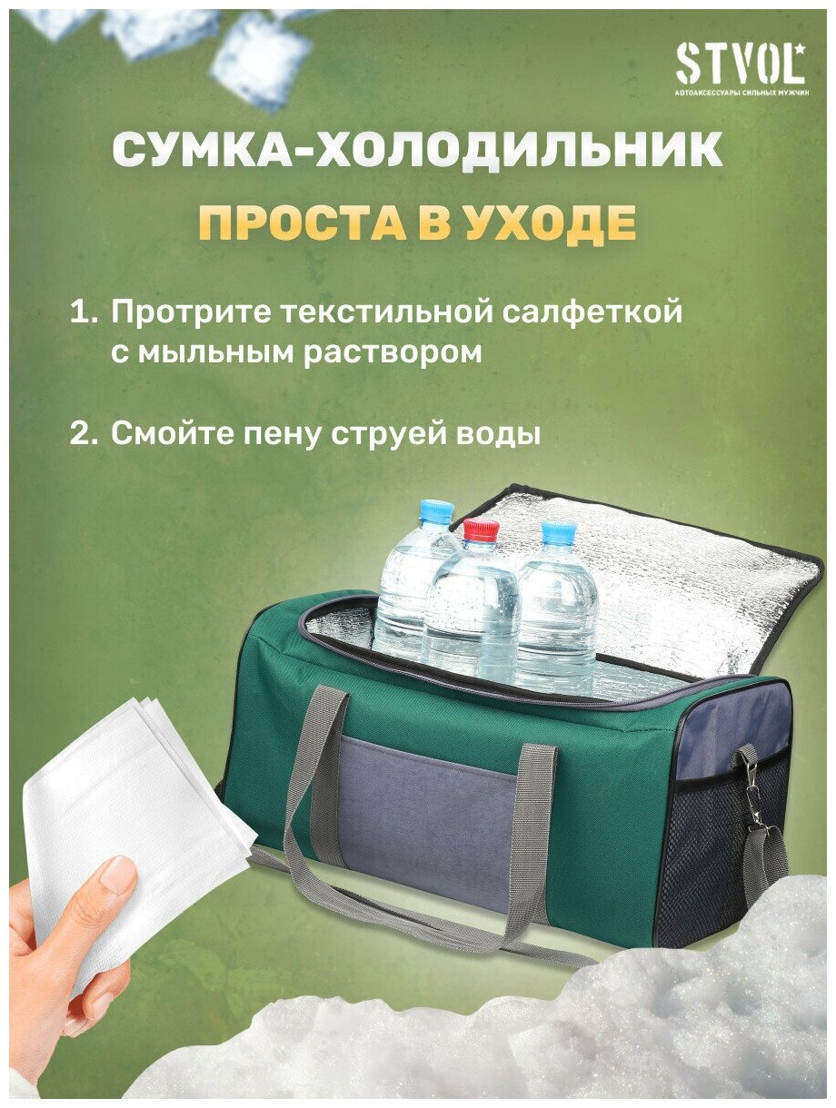 Сумка-холодильник для еды и напитков. Внутреннее пространство состоит из фольгированной газонаполненной пены, которая отлично сохраняет тепло и холод. Сама сумка сшита из прочного материала, не подверженного высвечиванию и истиранию.