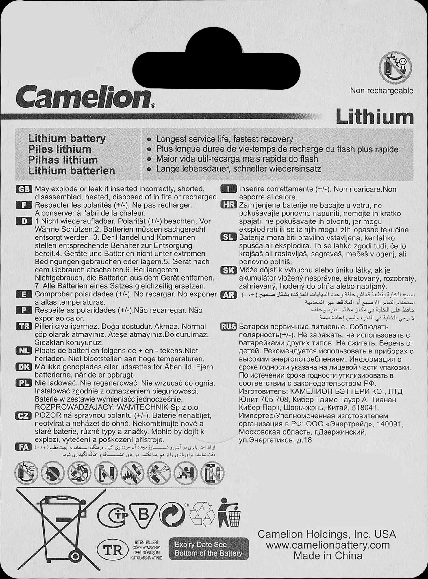 CR123A Батарейка CAMELION Lithium CR123A BP-1 1 шт. 1300мAч 1849