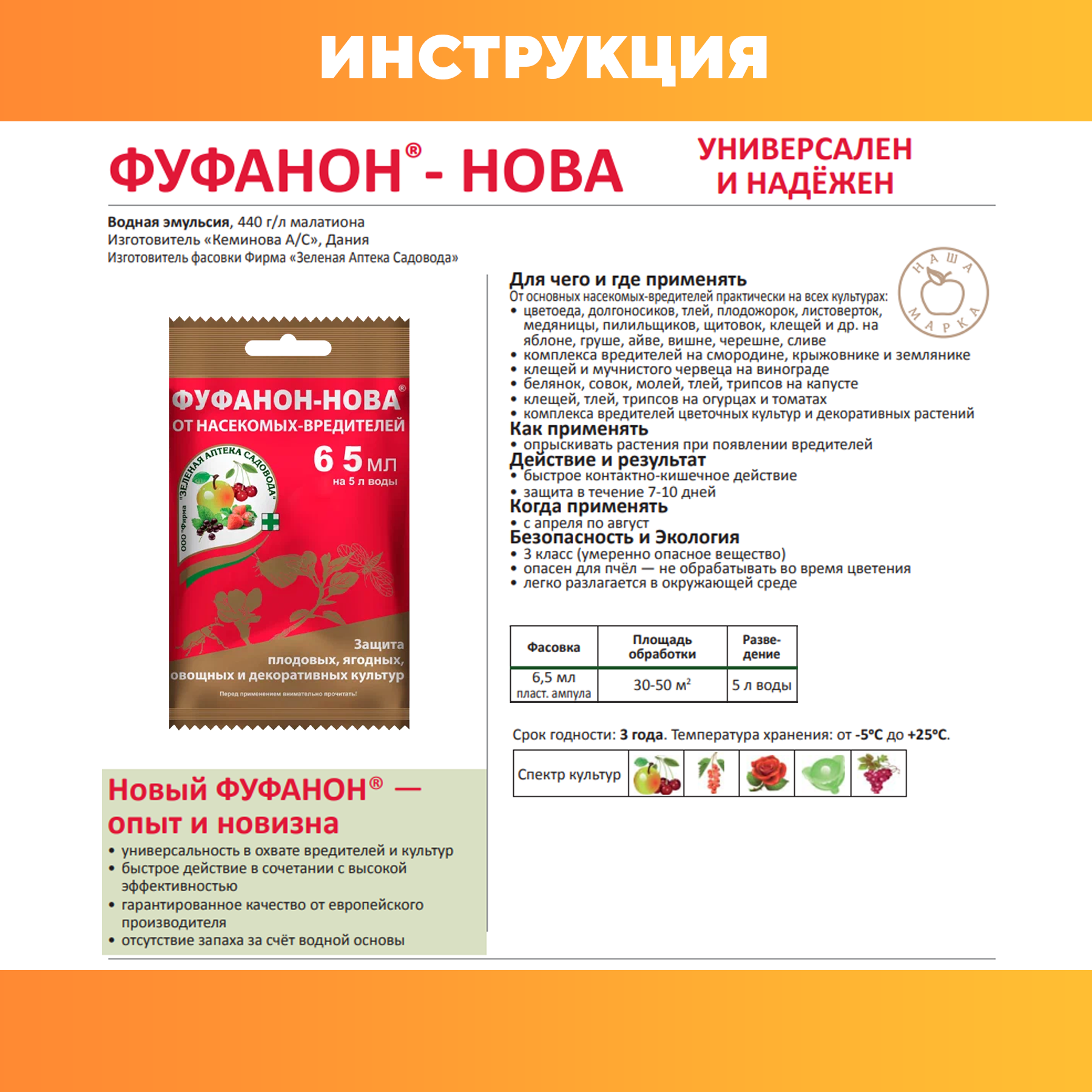 Водная эмульсия, 440 г/л малатиона. От основных насекомых - вредителей практически на всех культурах: