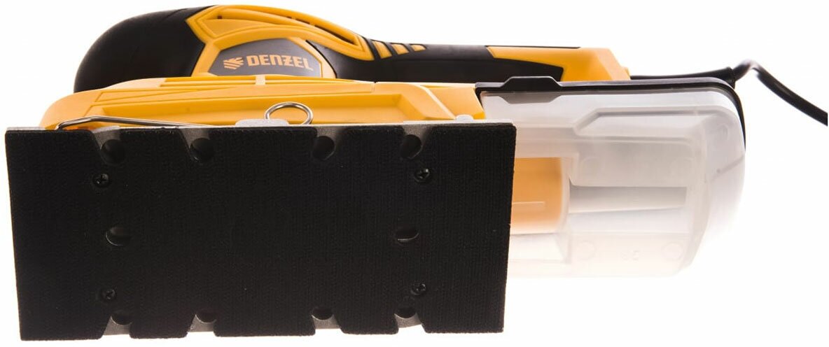 Вибрационная плоскошлифовальная машина Denzel мощностью 240 Вт, с частотой колебаний подошвы 6000-11000 об/мин, подходит для сухого шлифования, зачистки и полировки поверхностей. Регулировка частоты колебаний подошвы 6000-11000 об/мин позволяет выбрать оптимальный режим работы. Размер рабочей поверхности составляет 90 х 187 мм, ход платформы — 1,6 мм, благодаря чему машина эффективно справляется с обработкой больших поверхностей. ПреимуществаЭффективность — металлическая рабочая подошва обеспечивает высокую производительность, а благодаря прямоугольной форме позволяет производить обработку в углах. Чистота на рабочем месте — конструкцией предусмотрена встроенная система сбора пыли. Универсальное крепление — можно использовать как абразивный материал на липучках (VELCRO), так и обычную шлифовальную бумагу. Простой уход — пластиковый контейнер для мусора легко снимается и разбирается. Электробезопасность — токопроводящие элементы имеют двойную изоляцию, инструменту присвоен класс защиты II. Сетевой кабель 3 м — можно свободно перемещаться по рабочей зоне. Полная готовность к работе — в комплект входит пластина для прокалывания шлифбумаги, запасные угольные щетки и шлифовальное полотно. Комфортная работа — благодаря фиксатору кнопку включения не нужно постоянно удерживать, рукоятка с эластичными накладками не скользит в руке. Гарантия 3 года — надежность шлифмашины подтверждена производителем.