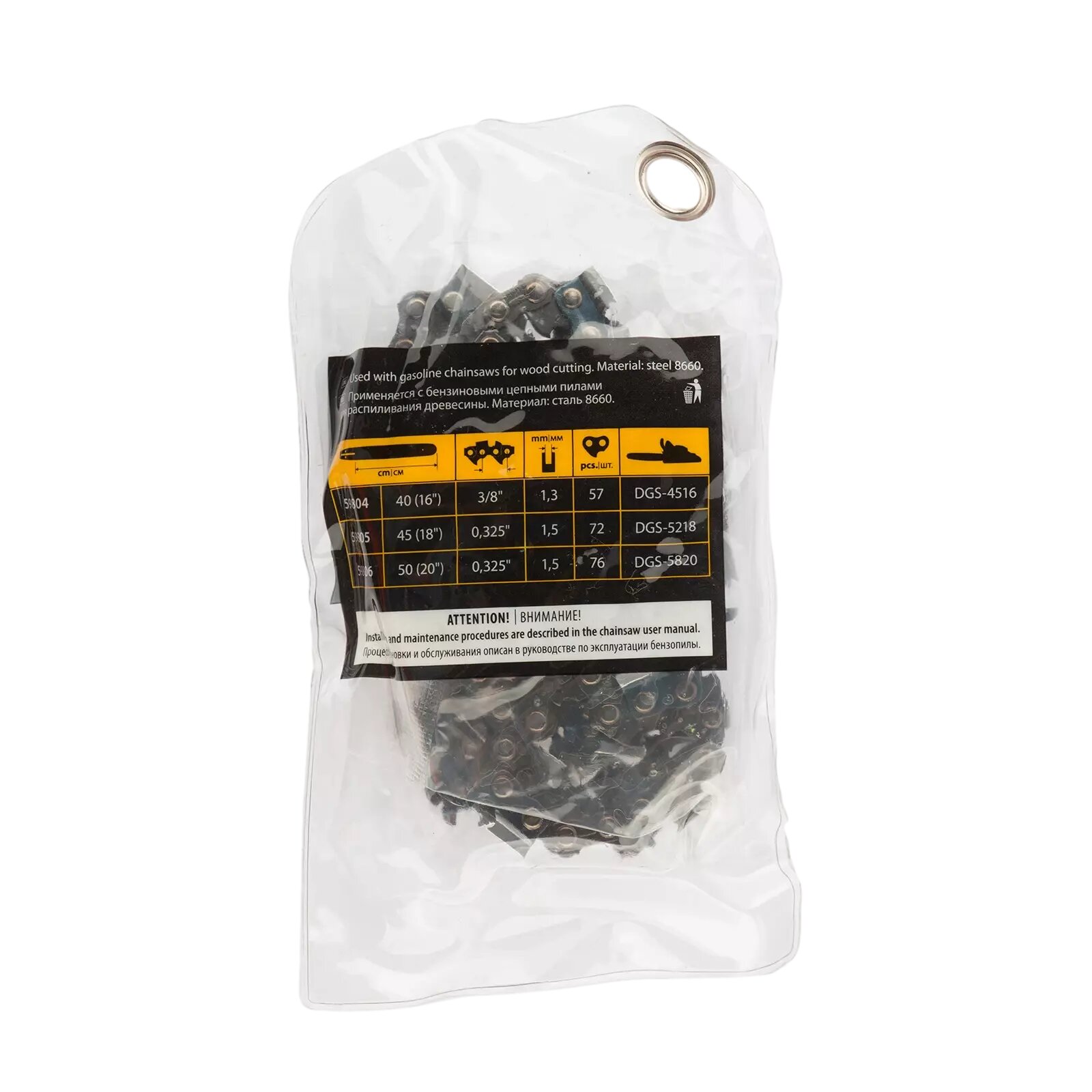 Цепь Denzel надевается на шину длиной 50 см (20") и используется совместно с бензопилой Denzel DGS-5820. Состоит из 76 звеньев (паз 1,5 мм, шаг 0,325"), позволяет решать полупрофессиональные задачи: валку деревьев, строительство, подпиливание толстых сучьев, заготовку дров и т.д.