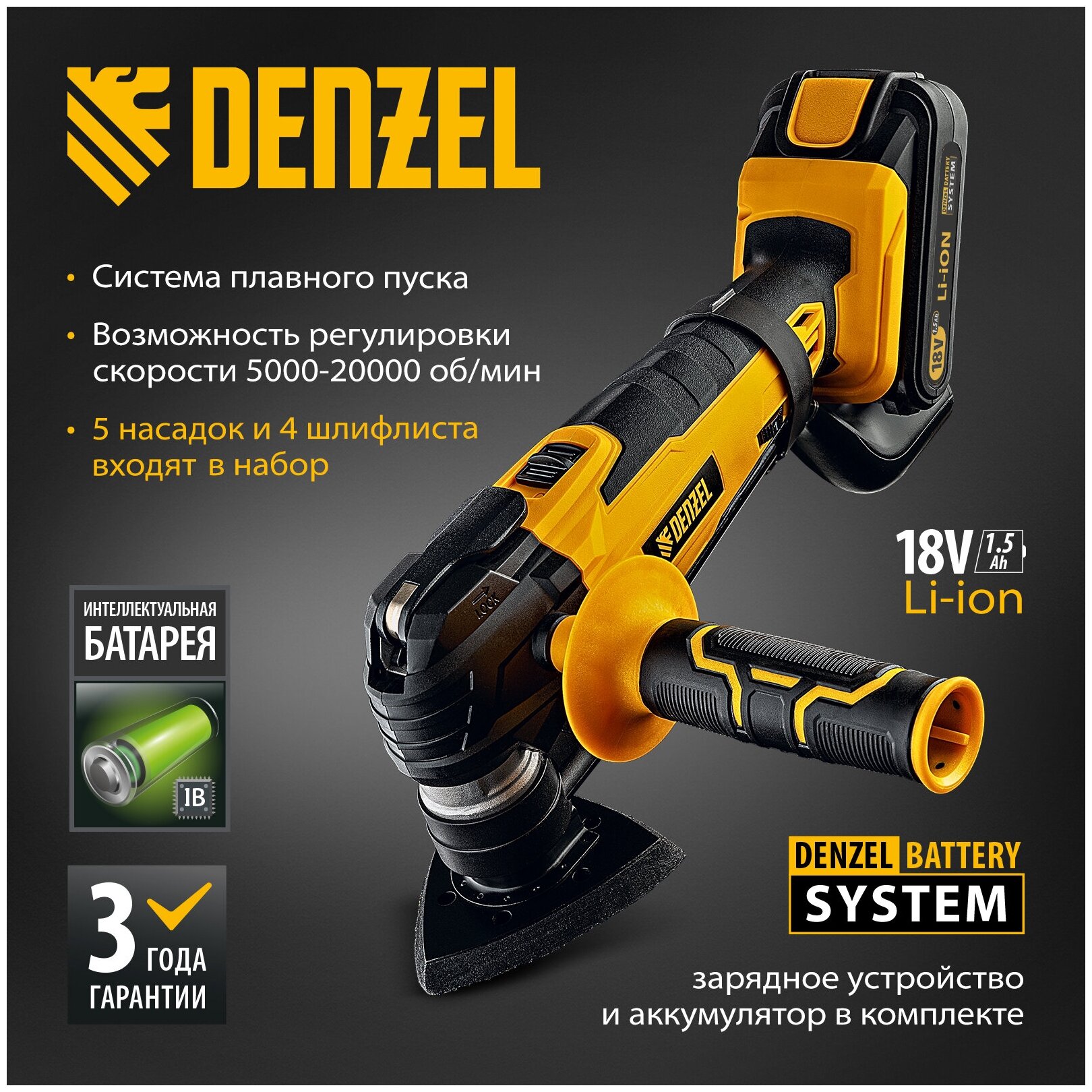 Многофункциональный аккумуляторный инструмент Denzel предназначен для выполнения широкого спектра задач: распила, подрезания, зачистки, обдирки практически любых ов, например, дерева, металла, керамики. С высокой эффективностью работает даже в местах, недоступных для обычного лобзика и шлифовальной машины.Аккумуляторы Li-Ion 18 В с защитой от глубокого разряда и перезаряда обеспечивают не только автономность инструмента, но и высокие технические характеристики.Преимущества:Возможность регулировки скорости (5000-20000 об/мин) и частоты вибраций позволяет легко настроить оптимальный режим работы, исходя из типа задачи и обрабатываемой поверхности.Система плавного пуска позволяет начать обработку поверхности без рывков и предотвратить ее повреждение, а также защищает двигатель от перегрузки.Инструмент способен отрезать вровень с поверхностью, например, встык к стене плинтус, что невозможно сделать ни лобзиком, ни пилой.Аккумуляторы LI-Ion 18 В совместимы с любым инструментом из линейки Denzel IB 18 В.Быстродействующее зарядное устройство для аккумулятора и стартовый набор насадок входят в комплект поставки, поэтому инструмент готов к работе сразу после приобретения.Бесключевая смена оснастки делает переключение между задачами быстрым и простым.Подсветка рабочей поверхности упрощает работу в плохо освещенных местах.Боковой держатель с рельефным покрытием обеспечивает удобный захват инструмента и комфорт в работе. Доступны 2 варианта его расположения: слева и справа.Световой индикатор позволяет понять, когда нужно зарядить аккумулятор.Инструмент весит всего 1,46 кг, поэтому мастер не устанет при длительной работе.