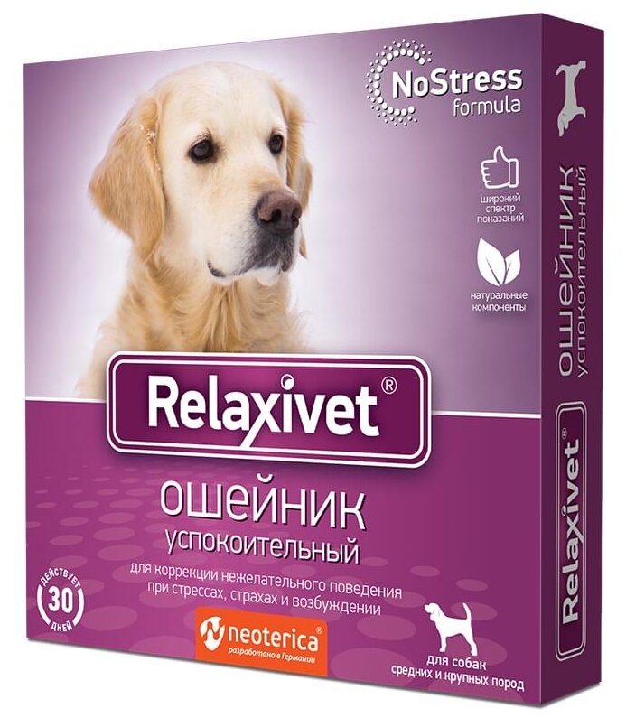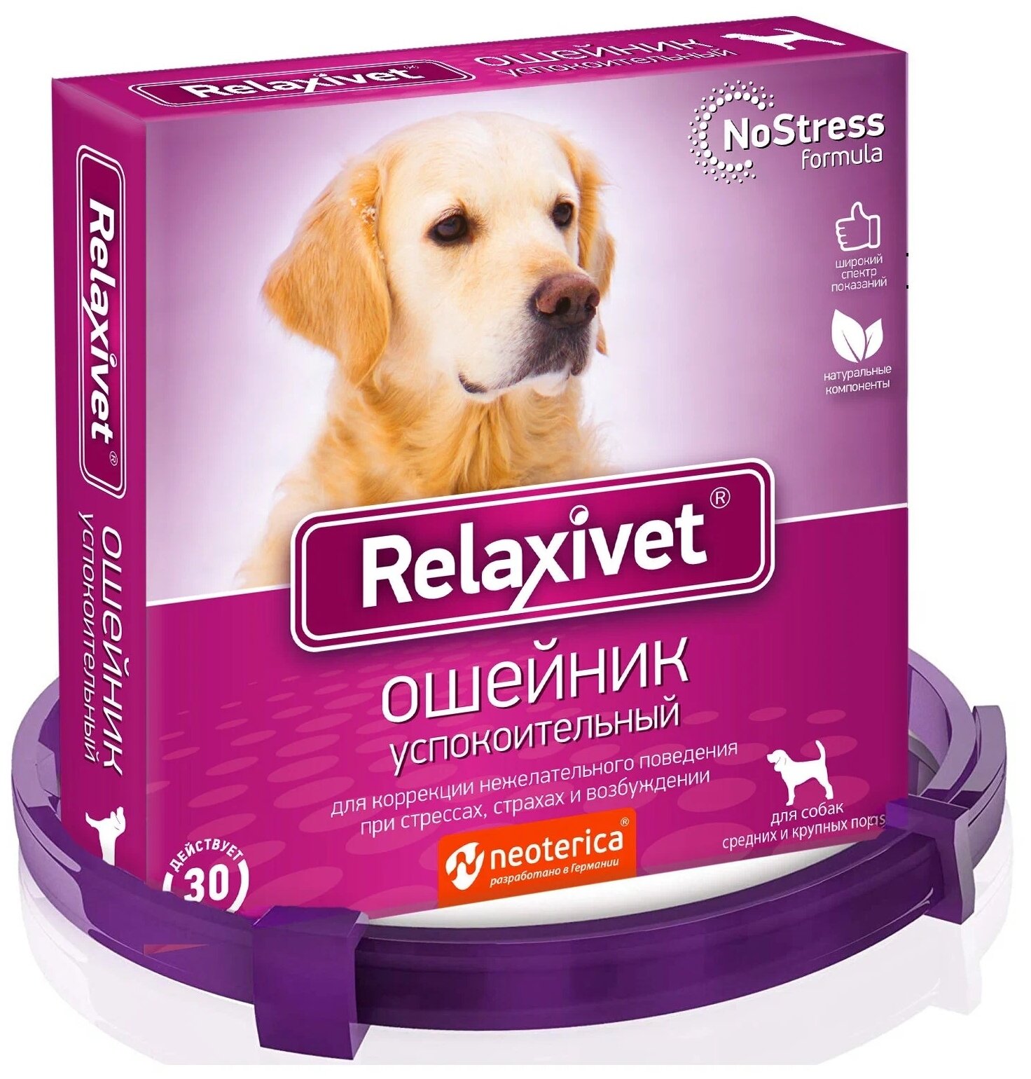 Релаксивет ошейник успокоительный предназначен для коррекции нежелательного поведения при стрессах, страхах и возбуждении у собак.