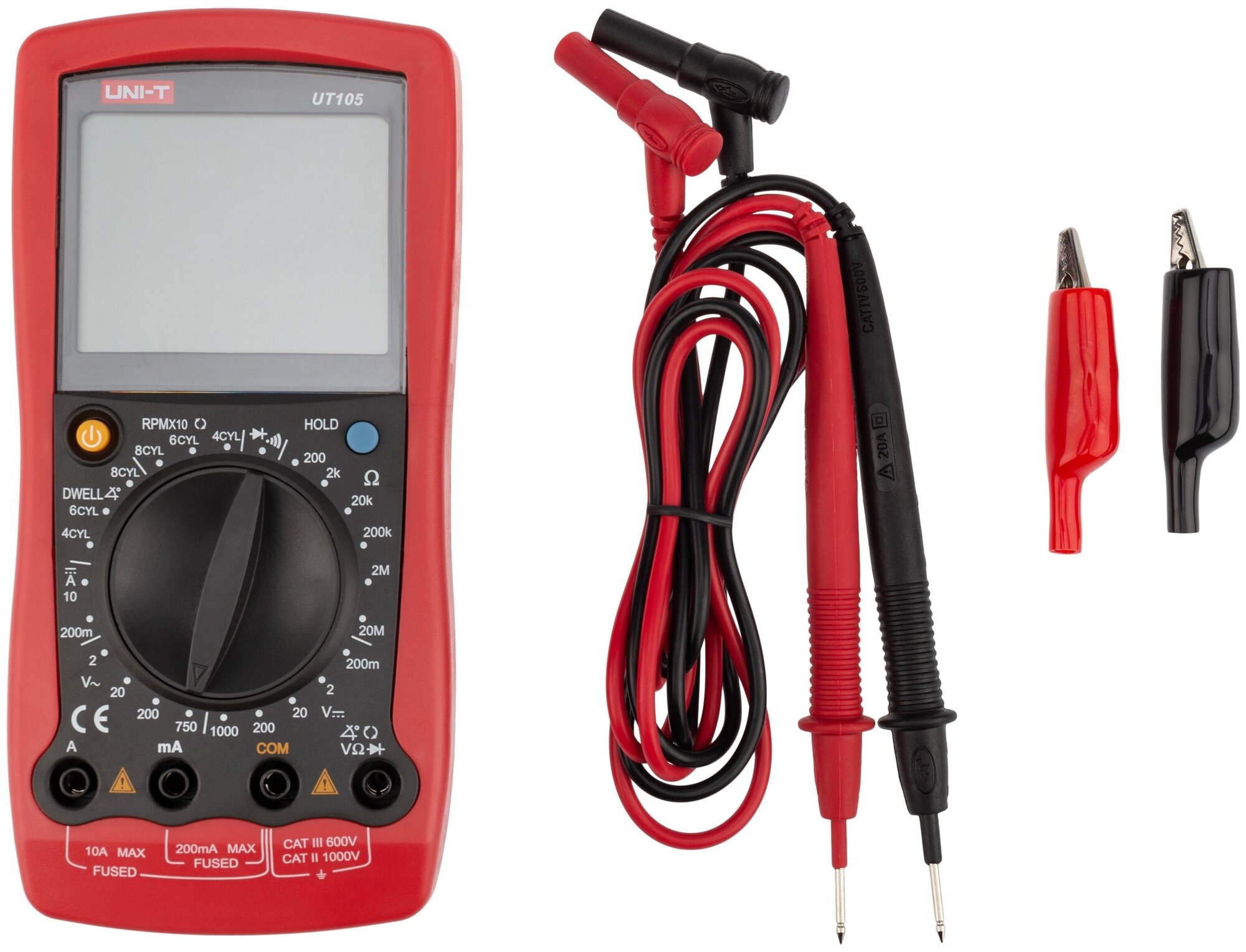Цифровой автомобильный мультиметр UT105 – является многофункциональным и надёжным измерительным прибором для автоэлектрика. UT105 используется при диагностике и ремонте автомобилей, для измерения числа оборотов коленчатого вала, угла прерывателя системы зажигания, частоты вращения двигателя, напряжения, тока, сопротивления, проверки диодов и прозвонки цепи на обрыв.Так же с помощью данного прибора можно диагностировать целый ряд автомобильных неисправностей, таких как: замок зажигания, проверка предохранителей, тест различных датчиков, соленоиды и реле.Прибор так же оснащён дополнительными функциями для удобства работы:-Функция удержания показаний (HOLD) – фиксирует полученные результаты измерений.-Индикация низкого заряда батареи позволит своевременно заменить элемент питания.-Особенностью данной модели является наличие тахометра и возможность определять угол опережения зажигания. Режимы для этих измерений выставляются по количеству цилиндров автомобиля.-Подсказки правильности подключения щупов. На дисплее отобразятся разъемы для правильного подключения щупов.-Корпус UT105 выполнен из высококачественного пластика, а так же облачён в защитный противоударный чехол.-Цифровой автомобильный мультиметр UT105 – является отличным выбором для автолюбителей, и сотрудников автосервисов, более того он прост в использовании, а так же имеет высокую точность измерений. Все приборы от компании UNI-T соответствуют стандартам IEC61010 на работу при загрязнении 2 степени, категории перегрузки (CAT II 1000В, CAT III 600В) и имеет двойную изоляцию.Технические характеристики мультиметра UT105:• Постоянное напряжение (DC) 200мВ/2В/20В/200В/1000В (±0.5%+5);• Переменное напряжение (AC) 2В/20В/200В/750В (±0.8%+5);• Постоянный ток (DC) 200мА/10А (±0.8%+5);• Сопротивление 200 Ом/2 кОм/20 кОм/200 кОм/2 МОм/20 МОм (±0.8%+5);• Измерение угла прерывателя 4/6/8 цилиндров (±3%+5);• Измерение оборотов (скорости вращения) 4/6/8 цилиндров (±3%+5);• Размер: 179x88x39мм;• Вес: 380 г. (с чехлом и батареей);• Скорость измерений: обновление данных 2-3 раза в секунду.