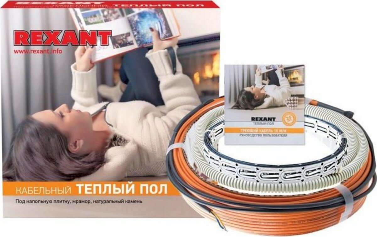 Комплекты кабельных теплых полов REXANT Standard на основе двухжильного кабеля. — гарантия 25 лет — тёплый пол в стяжку — работает от бытовой электросети — удельное тепловыделение 15 Вт/пог.м. — повышенная надёжность и электробезопасность Используемый в данных наборах кабель обладает повышенной надежностью и электробезопасностью. В комплектах теплых полов REXANT используется кабель с удельным тепловыделением 15 Вт/пог.м При использовании такого кабеля, достигается высокая равномерность нагрева пола, исключающая эффект тепловой "зебры" и высокая скорость достижения заданной температуры При расчёте необходимой мощности обогрева следует исходить из площади, не занятой стационарной мебелью и оборудованием, т.е. "чистой площади". Для того чтобы определить "чистую" площадь от линейных размеров комнаты, отнимите по 5-10 см отступа со всех стен и перегородок. От площади, вычисленной по этим размерам, отнимите площадь, занятую мебелью. Полученная величина будет составлять "чистую" площадь помещения. Зная "чистую" площадь помещения, возможно рассчитать шаг укладки кабеля: S (чист) х 100/L нс = Шаг укладки Затем определяетесь с необходимым режимом нагрева. Существует два режима использования тёплых полов Первый — когда теплые полы используются для создания комфортных условий в помещении с центральным отоплением. В этом случае необходимо, чтобы система выделяла 120 — 150 Вт на м2 свободной площади. Для ванных комнат, санузла и там где пол психологически кажется более холодным, стоит вести расчет, исходя из удельной мощности 150 — 180 Вт/м2. Второй возможный вариант, это когда тёплые полы используются в качестве основного источника обогрева помещения. В этом случае удельная мощность должна составлять 200 — 250 Вт на м2 свободной площади. В состав комплекта входят: нагревательные секции на основе одножильного или двухжильного экранированных кабелей монтажная лента для крепления нагревательного кабеля к полу защитная гофротрубка для термодатчика с заглушкой инструкция по эксплуатации с гарантийным талоном