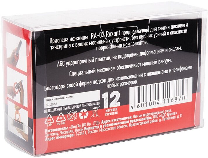 Съемник-присоска Rexant RA-03 в форме ножниц предназначен для удаления дисплея и touchscreenа со смартфонов, планшетов, коммуникаторов. Устройство позволяет отделить экран без лишних усилий, исключает опасность повреждения компонентов техники.
