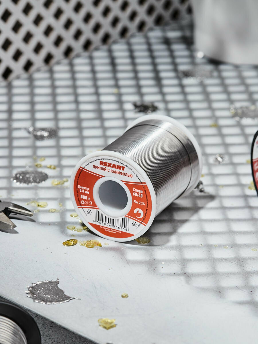 Припой с канифолью диаметром 0,8 мм позволяет создать герметичный, механически прочный и устойчивый шов. Обеспечивает защиту от химического воздействия и окисления в процессе пайки. Плавится при температуре 183-188 градусов Цельсия. Применяется для всех видов пайки, не является токсичным.