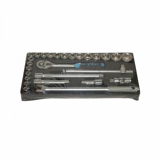Набор головок с инструментом 27 предметов в ложементе для инструментальной тележки или ящика. Набор инструментов в ложементе комплектуется головками 6-граней 8-32мм с приводом 1/2". Набор инструментов в ложементе 1/2" дюйма.Комплектация:- 1/2" Головка (6-ть граней): 8, 9, 10, 11, 12, 13, 14, 15, 16, 17, 18, 19, 20, 21, 22, 23, 24, 27, 30, 32 мм;- 1/2" Трещотка 36 зубцов;- 1/2" Удлинитель: 75, 125, 250 мм;- 1/2" Кардан;- 1/2" Вороток Т-образный 250 мм;- 1/2" Вороток шарнирный 375 мм.Прочее:- в пласт. лотке (ложементе) 197х420х40мм.Помимо качества и надежности рабочих материалов «AIST» уделяет большое внимание вопросу удобства и безопасности использования инструмента. Непрерывная работа в профессиональной деятельности всегда приносит усталость и мышечное напряжение. Для ручного инструмента специалистами компании «AIST» были разработаны современные рукоятки эргономичной формы, которые повторяют контур пальцев кисти руки, обеспечивая надежный захват и предотвращая неудобство и возможные повреждения конечности.Рукоятки сочетают в себе современный дизайн, долговечность, удобство в использовании.