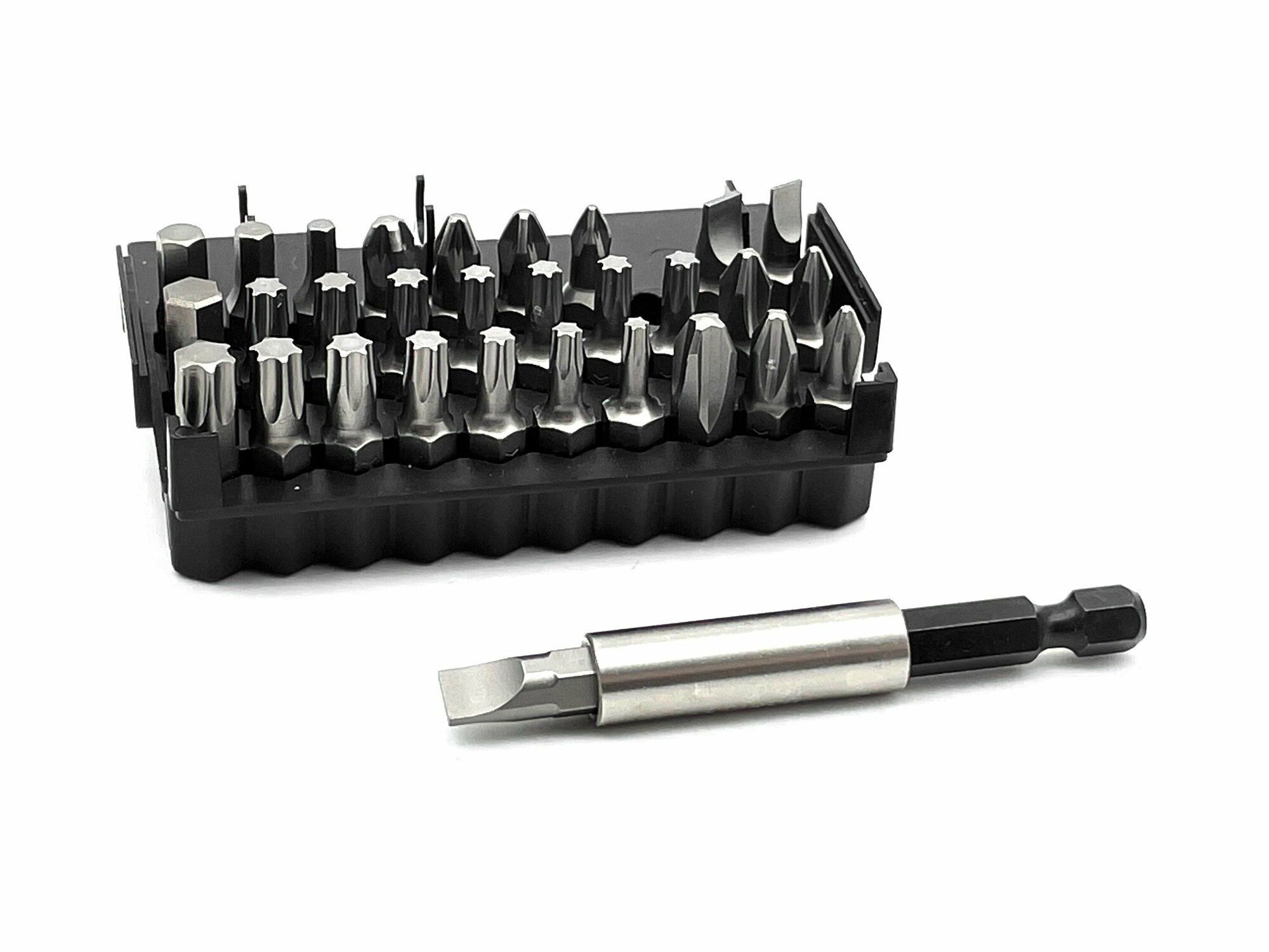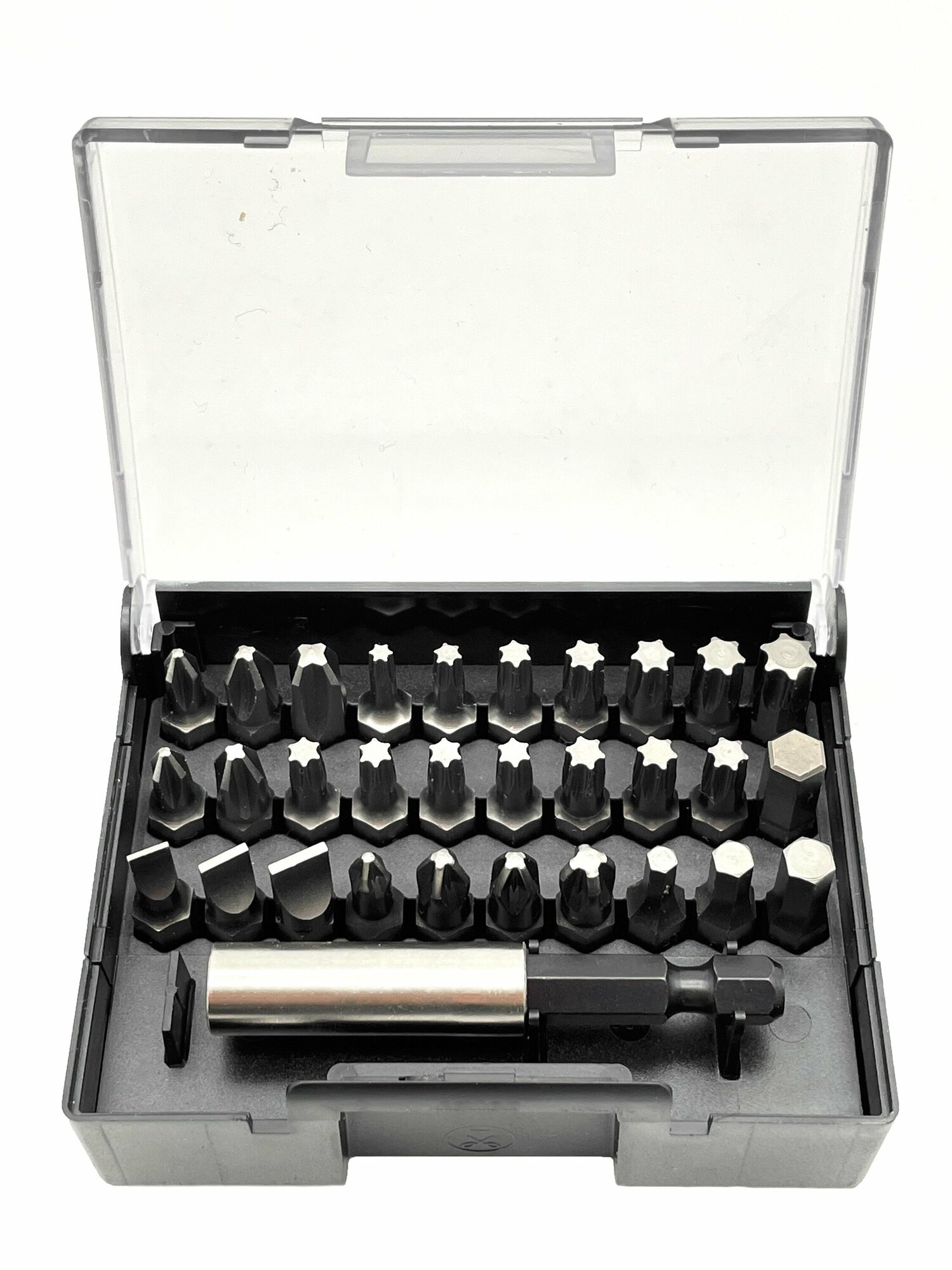 - Состав набора: 30 бит C6,3 x 25 мм, SL 4,5 x 0,6 / 5,5 x 0,8 / 6,5 x 1,2, PH 1 - 2 шт / PH 2 - 2 шт / PH 3, PZ 1 / PZ 2 - 2 шт / PZ 3, Hex 3 мм / 4 мм / 5 мм / 6 мм, Torx 10 / Torx 15 / Torx 20 - 5 шт / Torx 25 - 4 шт / Torx 27 / Torx 30 / Torx 40, Битодержатель E6,3 x 58 мм