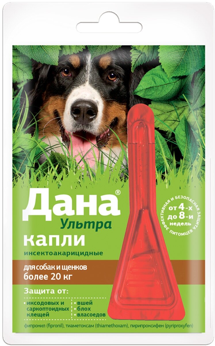 Дана Ультра капли на холку предназначен для профилактики и лечения собак и кошек, щенков и котят с 10-недельного возраста от заражения различными внешними паразитами (блохи, вши, власоеды, акарозы, вызываемых саркоптоидными и иксодовыми клещами). Полный эффект развивается через 24 часа и длится до 8 недель. Благодаря усиленному трёхкомпонентному составу к препарату Дана Ультра капли на холку не возникает устойчивости внешних паразитов. Компоненты Дана Ультра капель на холку прерывают цикл развития насекомых в том числе и на стадии личинки. Дана Ультра капли на холку сочетают в себе высокое качество и привлекательную цену.