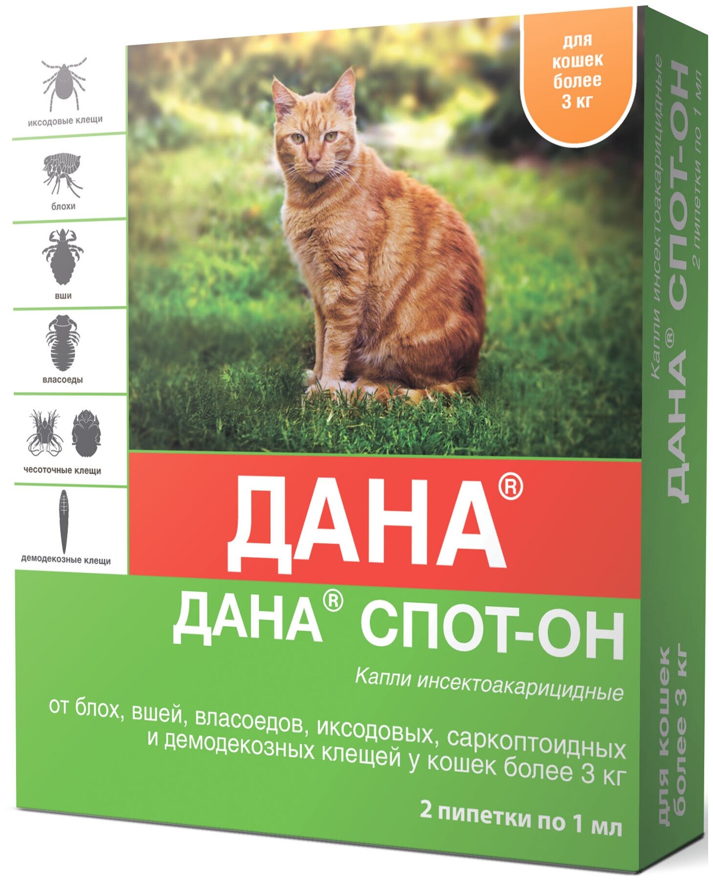 Дана Спот-он назначают собакам и кошкам с 12-недельного возраста для лечения и профилактики энтомозов, вызываемых блохами, вшами и власоедами; акарозов, вызываемых саркоптоидными, иксодовыми и демодекозными клещами, пушным зверям — для лечения и профилактики отодектоза. Противопоказанием к применению является индивидуальная непереносимость компонентов препарата, в том числе в анамнезе. Не подлежат обработке больные инфекционными болезнями и выздоравливающие животные, собаки массой менее 2 кг, кошки массой менее 1 кг. Не допускается аури- кулярное применение препарата (при ушной чесотке) при прободении барабанной перепонки.