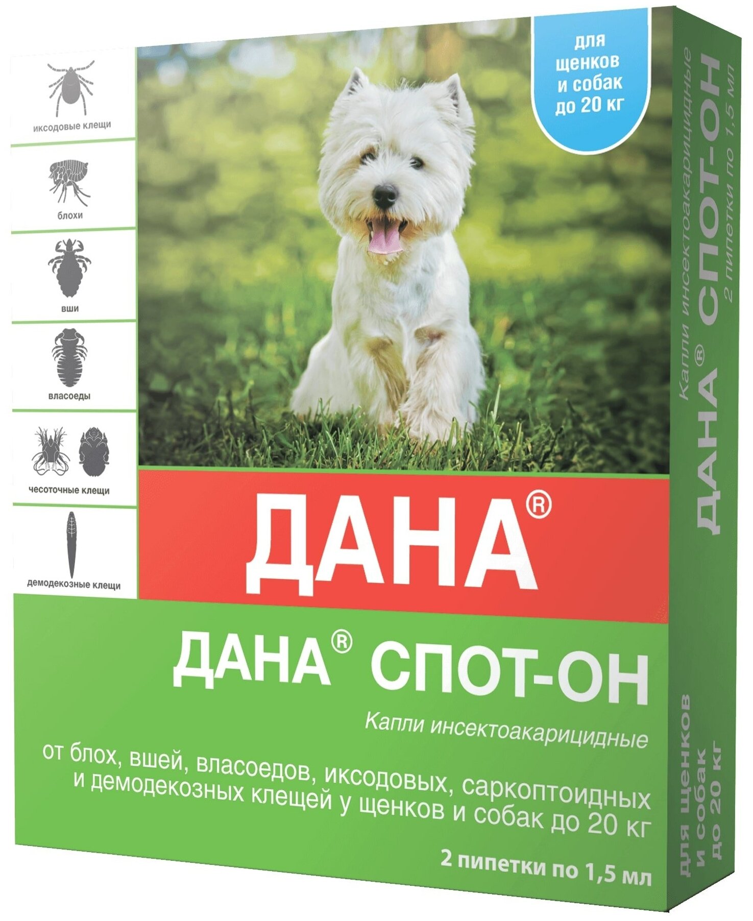 Препарат для борьбы с эктопаразитами плотоядных животных Дана Спот-он назначают собакам и кошкам с 12-недельного возраста.Дана Сопот-он относится к инсектоакарицидным средствам группы фенилпирозолов.Основные преимущества:- широкий спектр действия против наружных паразитов;- защита от иксодовых клещей в течение месяца;- защита от блох, вшей, власоедов в течение двух месяцев;- лечение и профилактика паразитарных болезней за одно применение;- быстрое начало действия — в течение суток после нанесения.