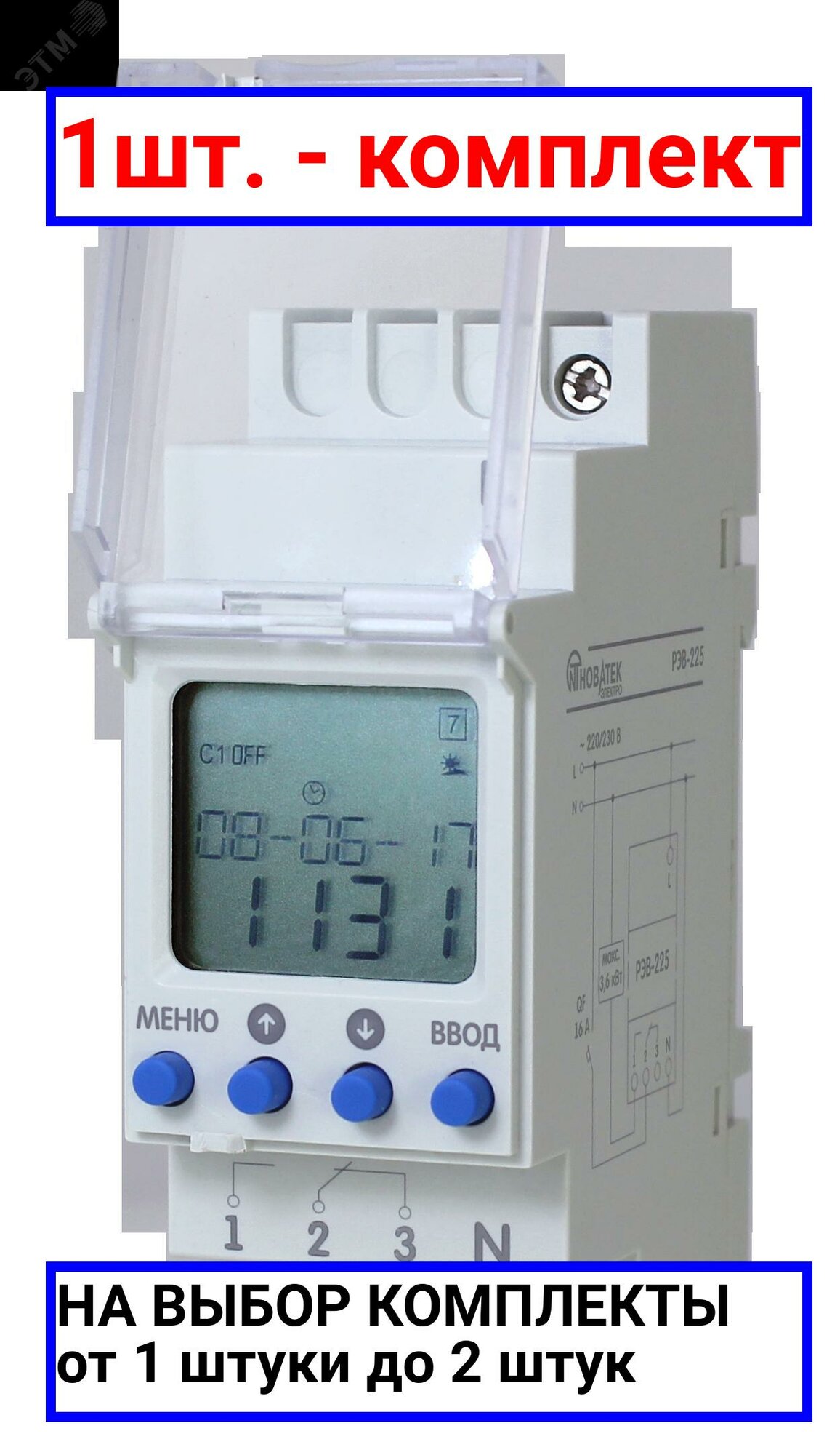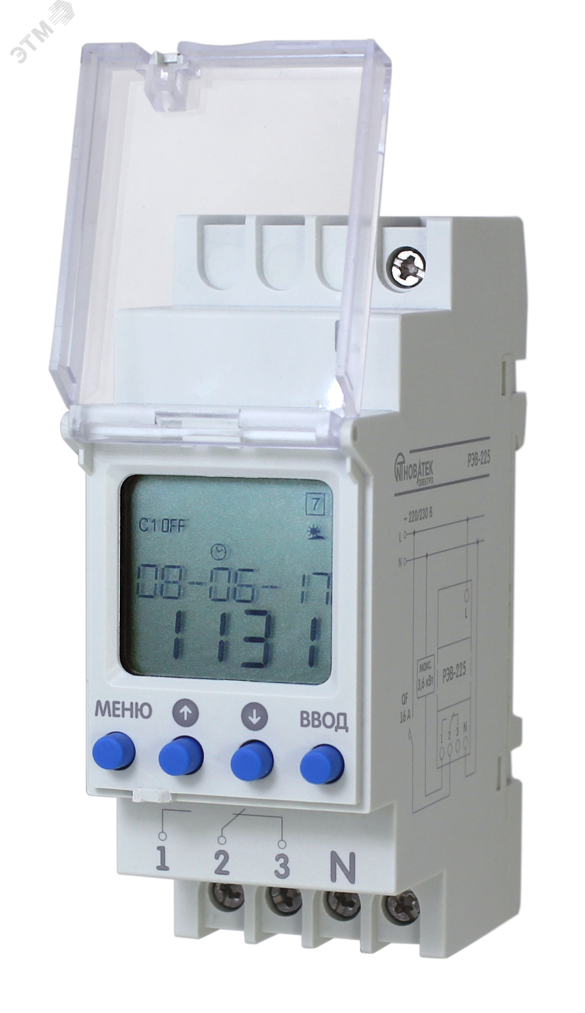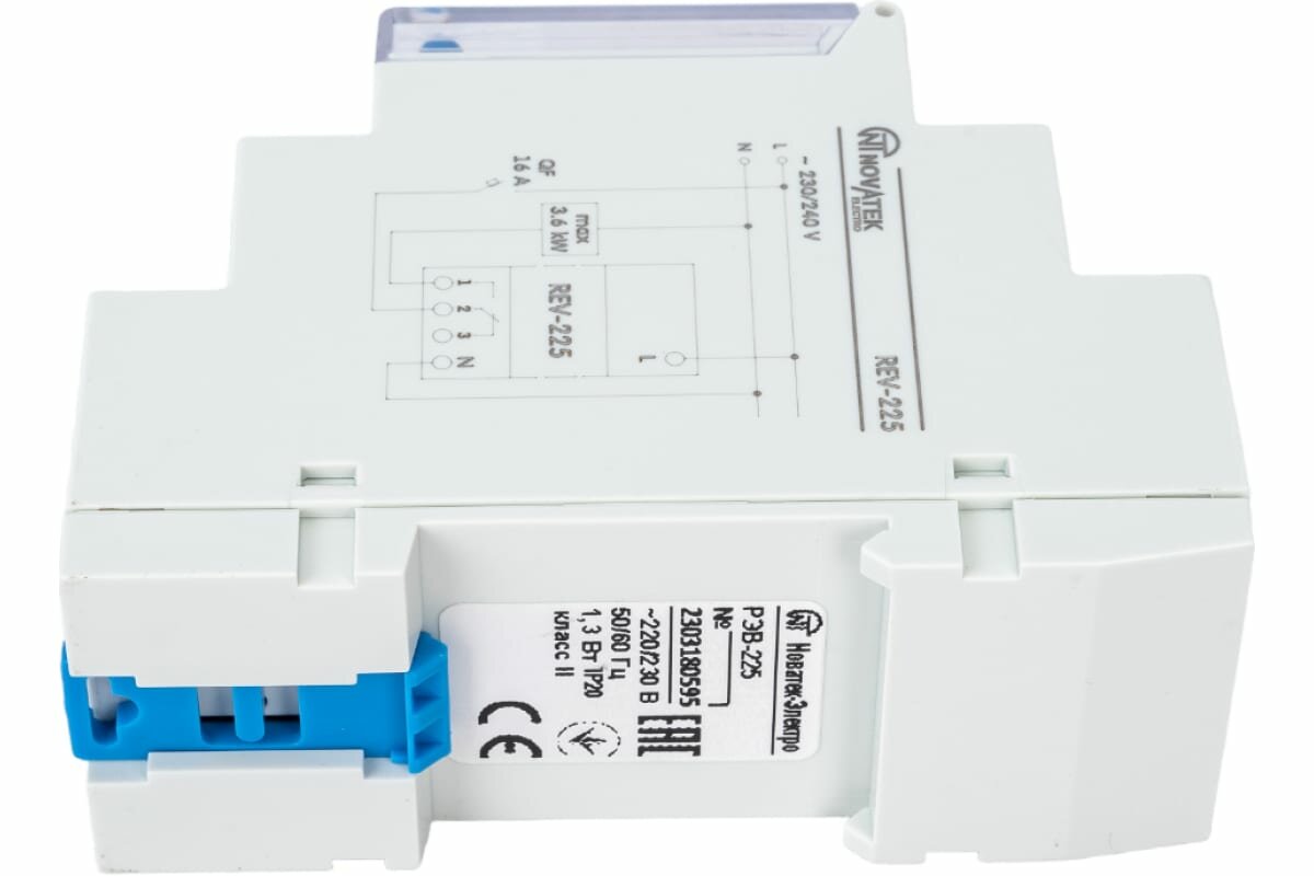 **Таймер астрономический Новатек РЭВ-225** — микропроцессорное устройство, предназначенное для работы в системах автоматического управления, функционирующих с привязкой к астрономическому времени. На основе введенных координат устройство в зависимости от восхода и заката солнца управляет освещением без применения наружных датчиков. Литиевая батарея обеспечивает сохранность рабочих часов без подключения к сети переменного тока.
