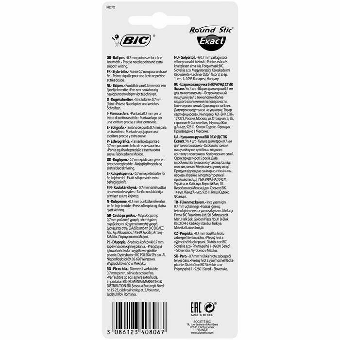 Тонкий пишущий узел шариковой ручки BIC Round Stic Exact диаметром 0.7 мм пишет с чрезвычайно высокой точностью и при этом плавно скользит по странице. Эта ультраточная ручка идеально подходит для тех, кто любит тонкие линии и сложные детальные рисунки. Лёгкую, как перышко, конструкцию с округлым корпусом одно удовольствие держать в руке. Дизайн выполнен в двух тонах - гладкий серый корпус дополнен синим, чёрным или красным грипом, который соответствует цвету чернил. BIC Round Stic Exact с безукоризненно выполненным шариком и системой равномерной подачи чернил обеспечивают по-настоящему мягкое письмо. А знаете ли вы, что французский предприниматель Марсель Бик представил первую ручку BIC ещё в 1950 году? Опираясь на свою богатую историю, бренд BIC приобрел непревзойденную экспертизу в разработке пишущих инструментов. Миссия создавать товары высокого качества для каждого и по доступной цене помогла компании завоевать доверие потребителей и стать одним из мировых лидеров в производстве канцелярских товаров.