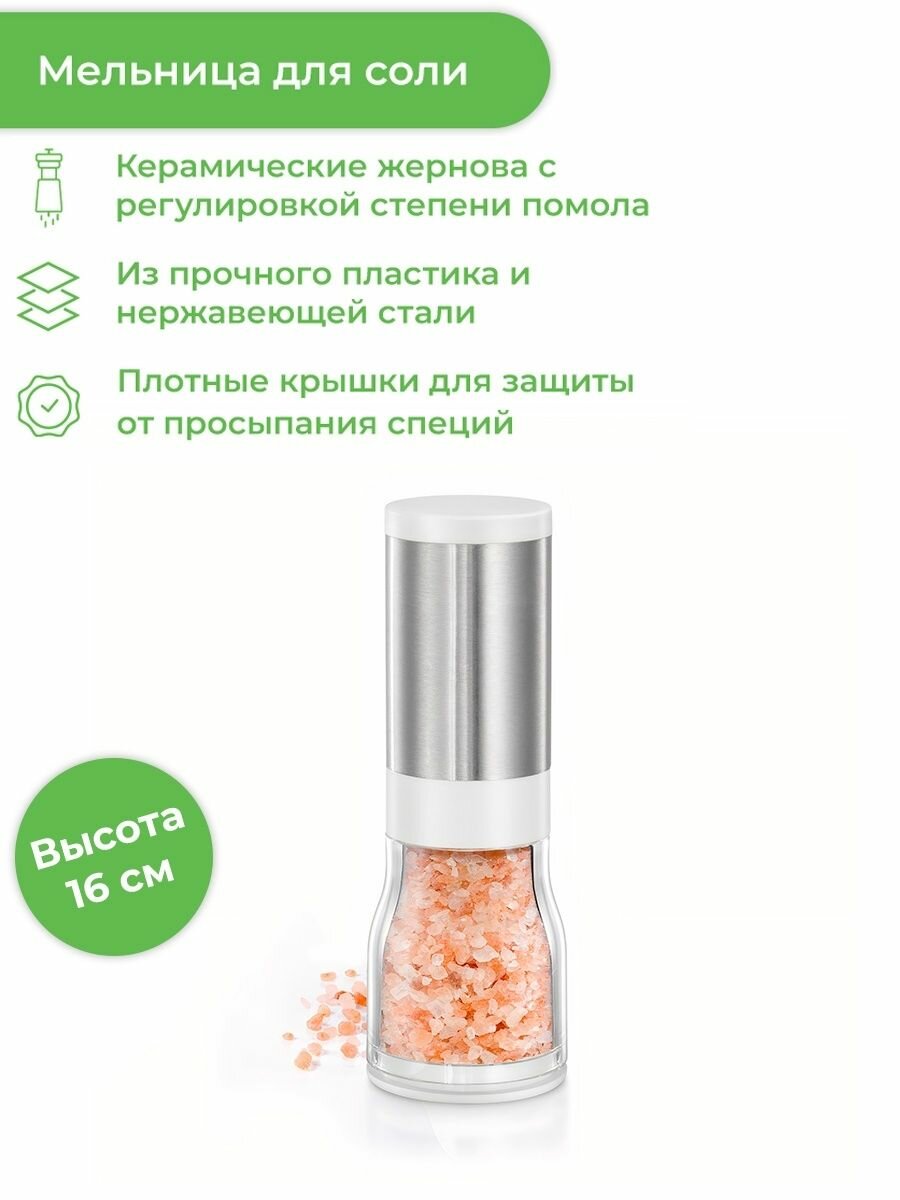 Отлично подходит для приправы блюда свежемолотой солью. С высококачественным керамическим механизмом помола, регулировкой размера зерна и крышкой для перехвата остатков специй. Изготовлено из высококачественной нержавеющей стали и прочной пластмассы. Почистите влажной тканью и высушите.