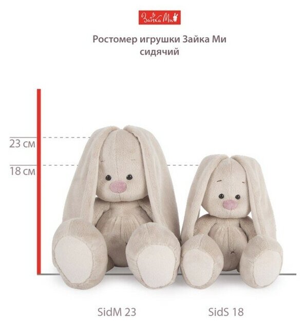 Зайки Ми выпускаются в разных размерах от 15 см до 35 см. Лапы могут быть мягкими (тогда игрушка сидячая), либо твердыми (тогда игрушка устойчивая).