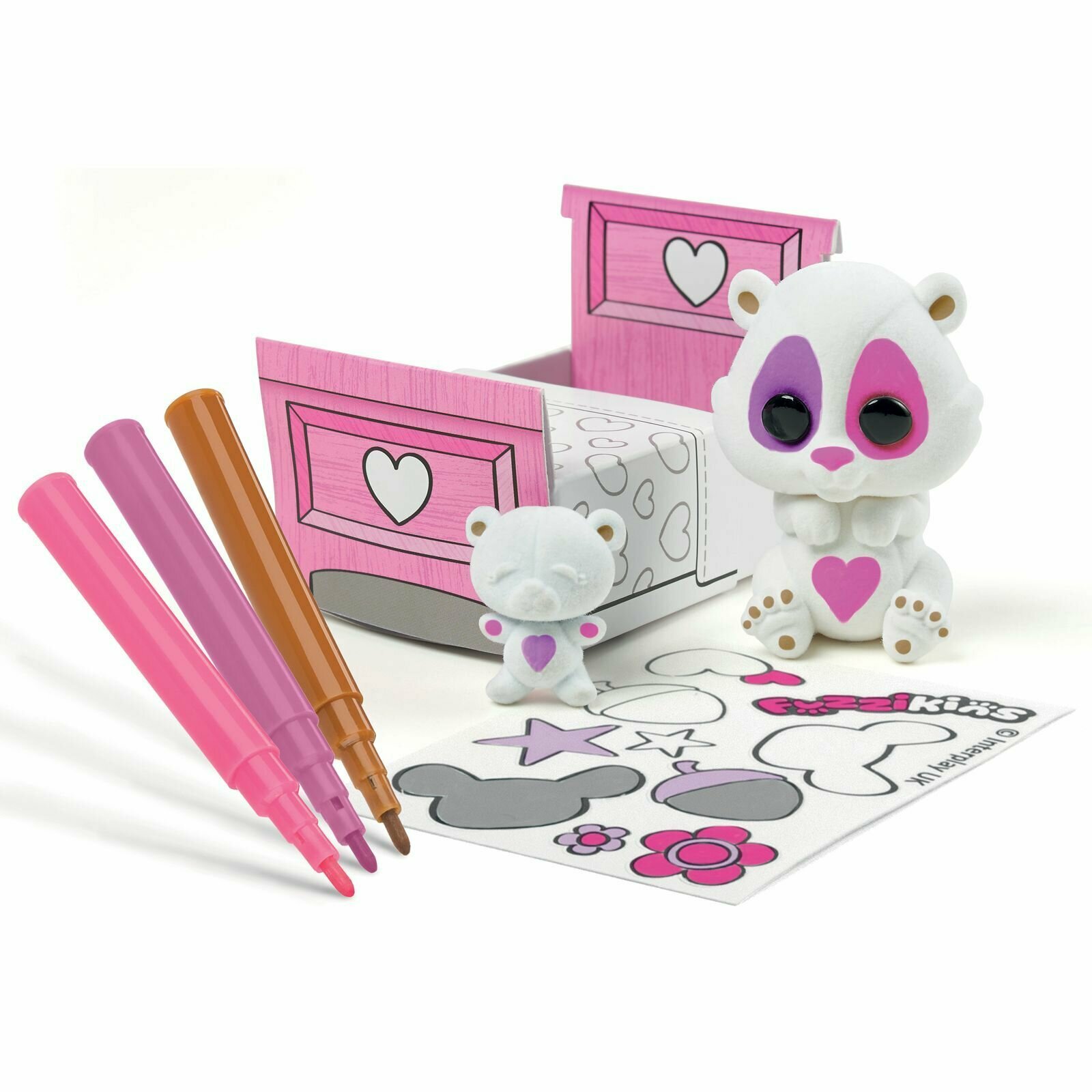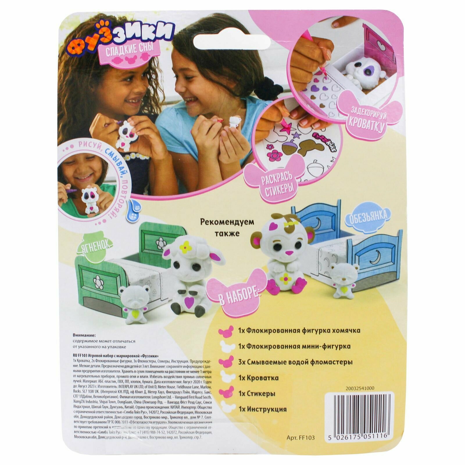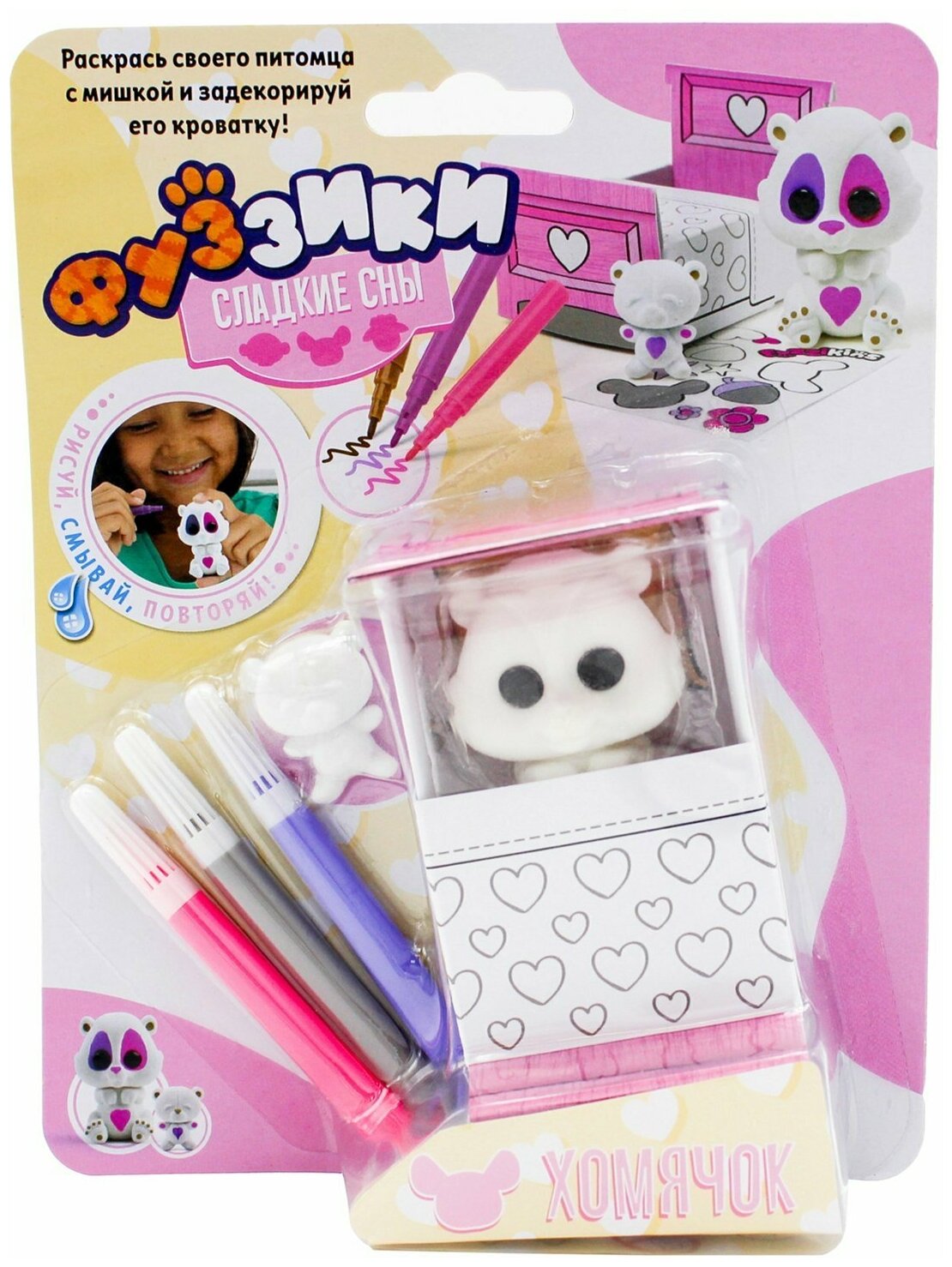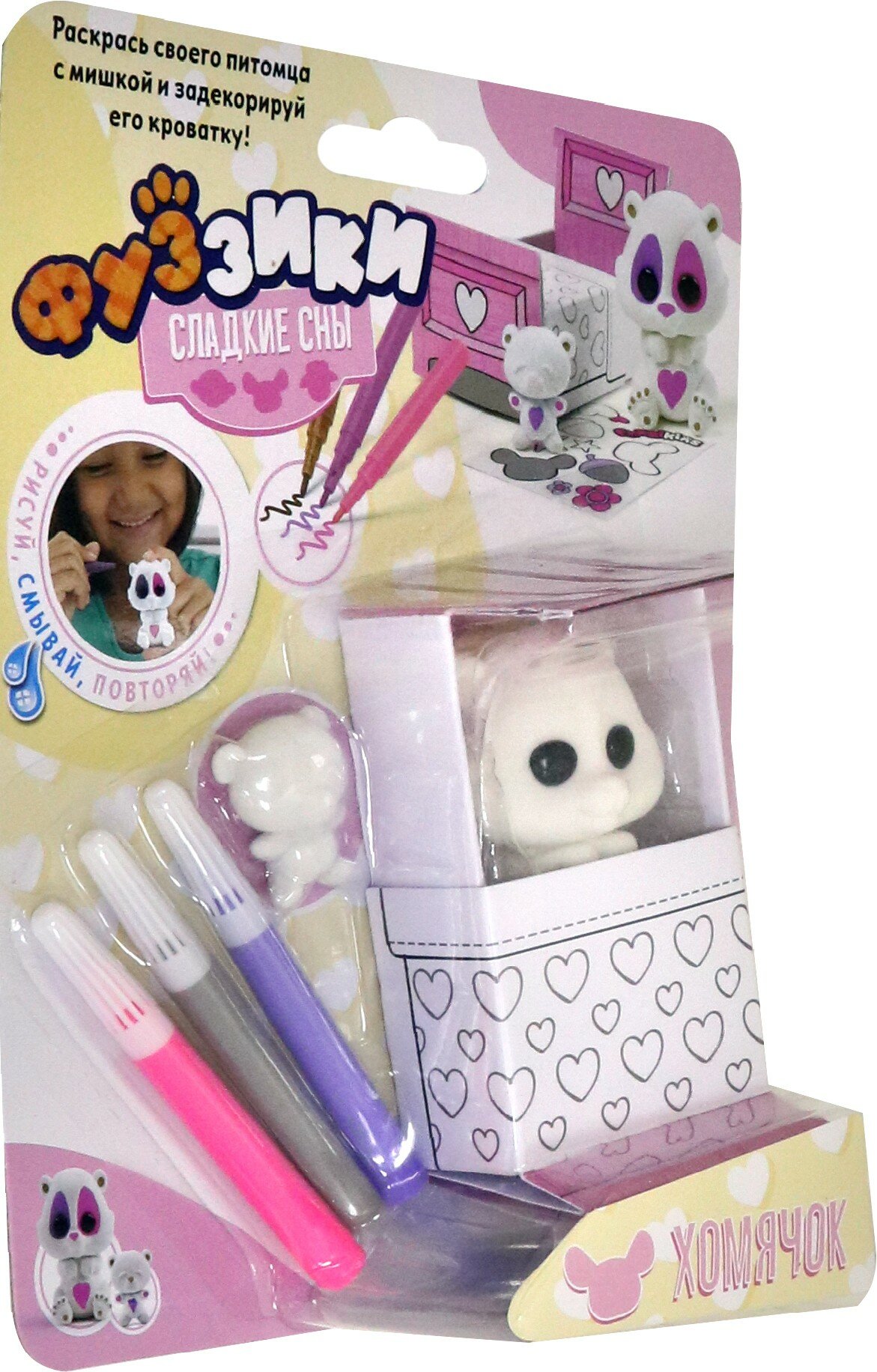 В наборе вы найдете хомячка в кроватке, смывающиеся водой фломастеры и стикеры, чтобы украсить и персонализировать флокированного малыша и его кроватку.