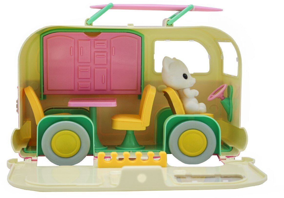 Игровой набор состоит из 3-х флокированных фигурок Котят разного размера, которые отправились в путешествие в Домике на колесах, который оснащен встроенной мебелью для комфортного времяпровождения питомцев. Домик удобно брать с собой на прогулку или в гости, за счет портативной ручки - переноски, а для котят ручка-переноска трансформируется в настояшую доску для серфинга!