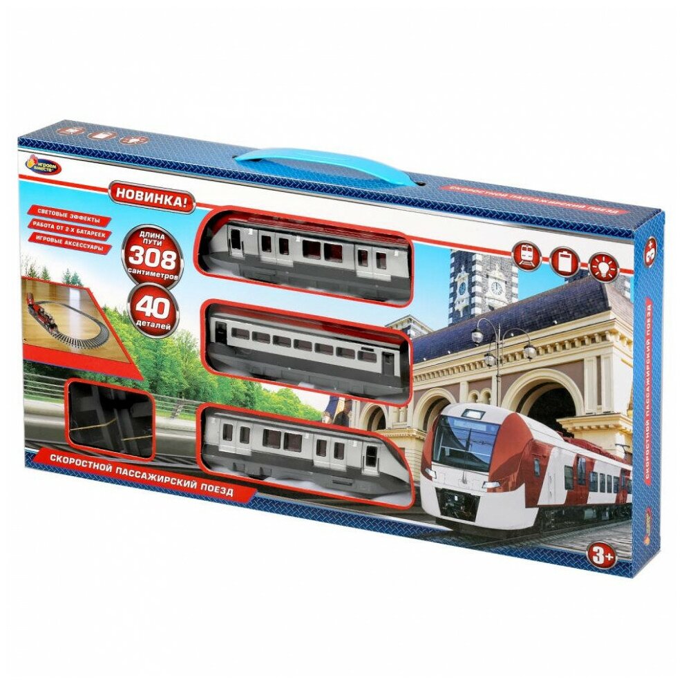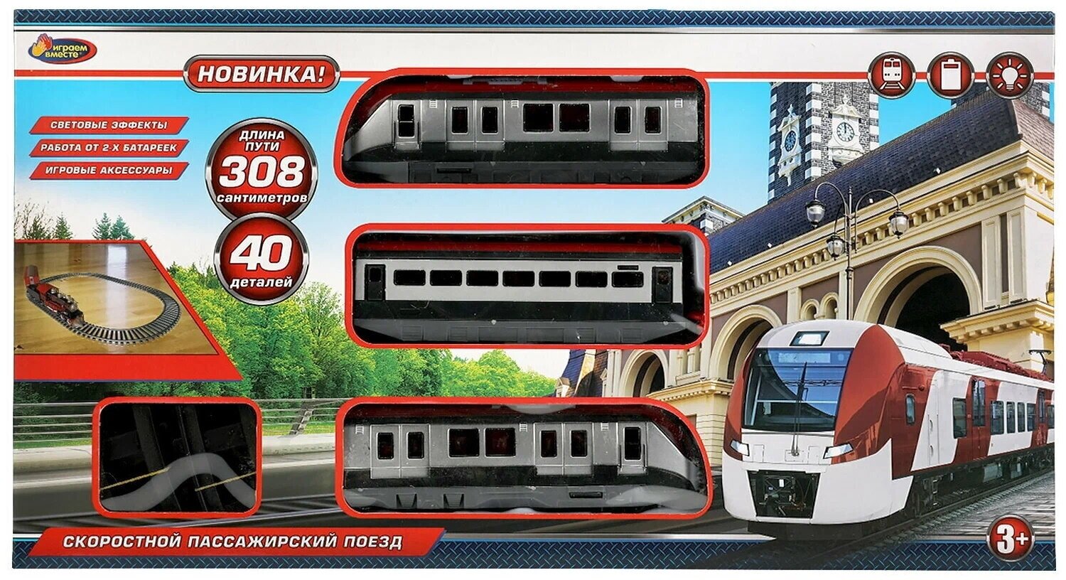 | В наборе | поезд (скоростной), вагон (3 шт.), рельсы (10 шт.), рельсовые соединители (13 шт.), стрелочный перевод (2 шт.), дерево/растение/цветок (дерево — 3 шт.; 3 зеленые опоры), семафор (2 шт.; 2 красные опоры) |