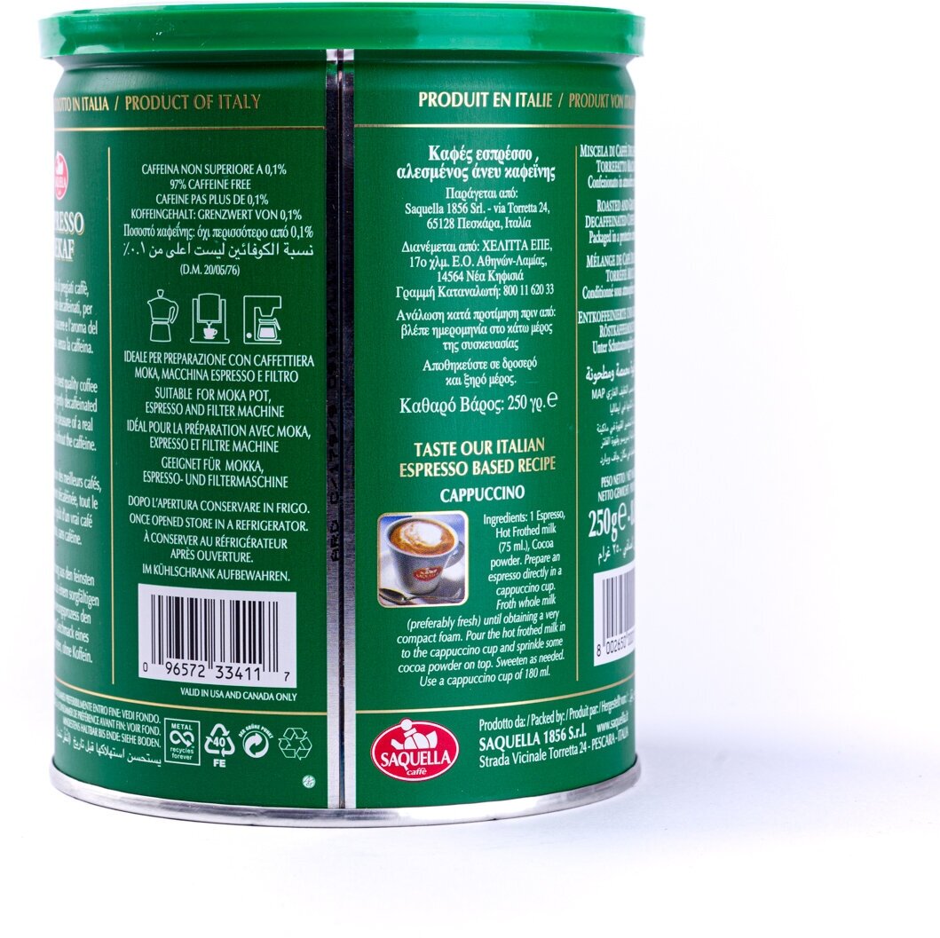 Кофе Saquella Espersso Dekaf- натуральный кофе из отборной бразильской арабики и индийской робусты, без кофеина.