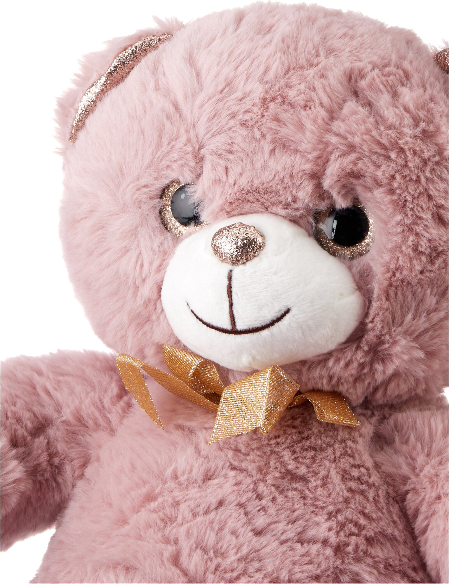 У медвежонка блестящие золотистые глазки, носик и внутренняя часть ушек. На шее красуется стильный золотой бантик. Игрушка очень красивая! Ребёнку обязательно захочется подружиться с этим чудесным мишкой!