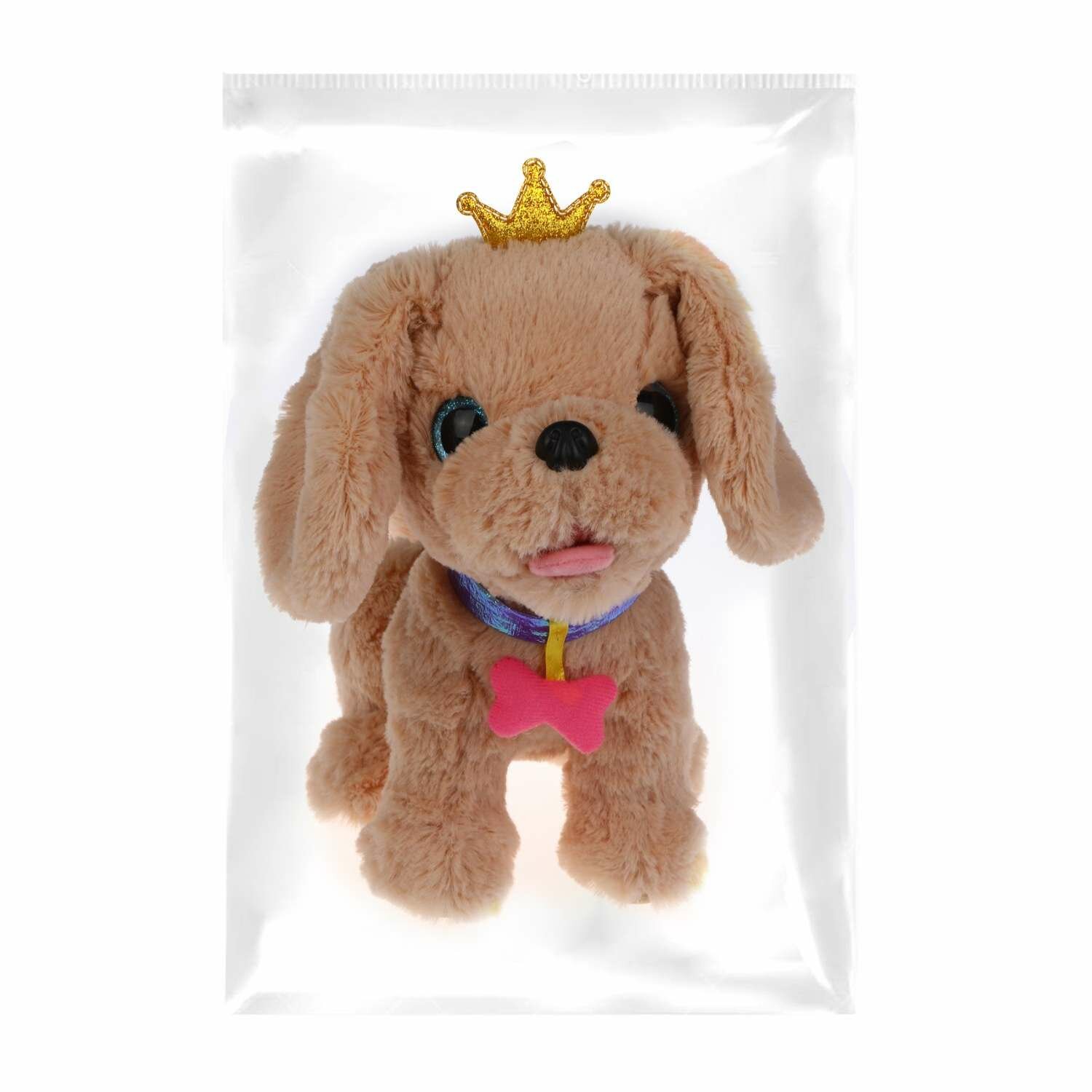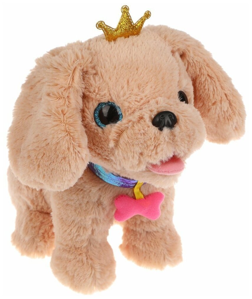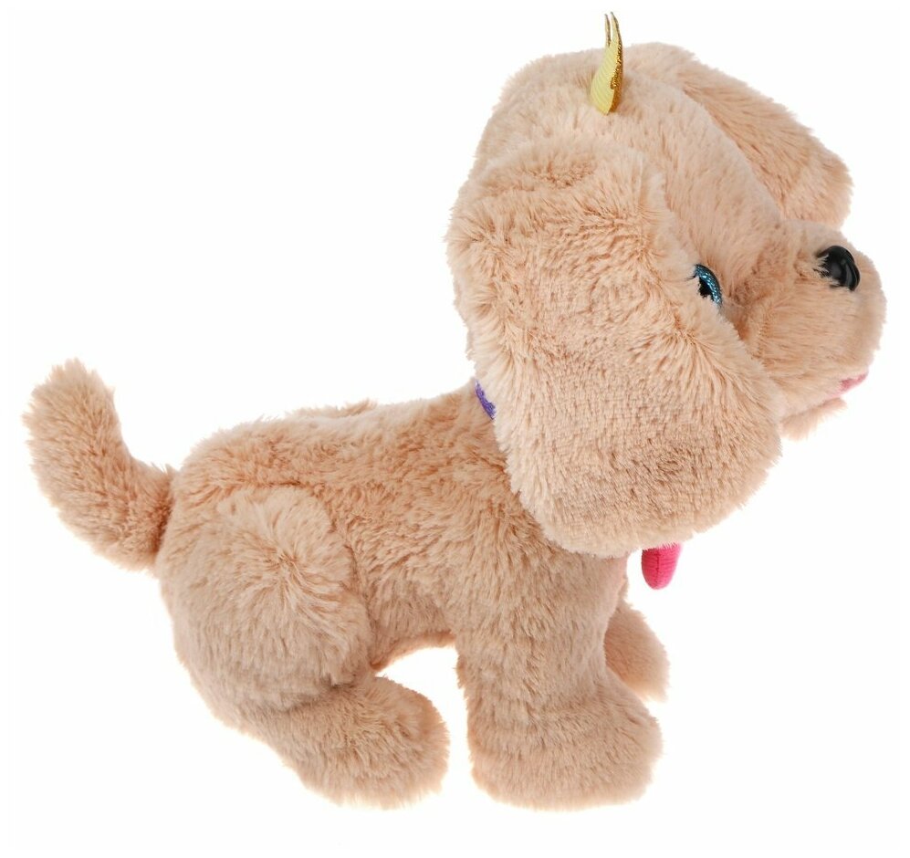 Пёсик обладает мягкой шёрсткой бежевого цвета, блестящими голубыми глазками и чёрным носиком. На шее у собачки надет оригинальный ошейник цвета фиолетовый металлик с