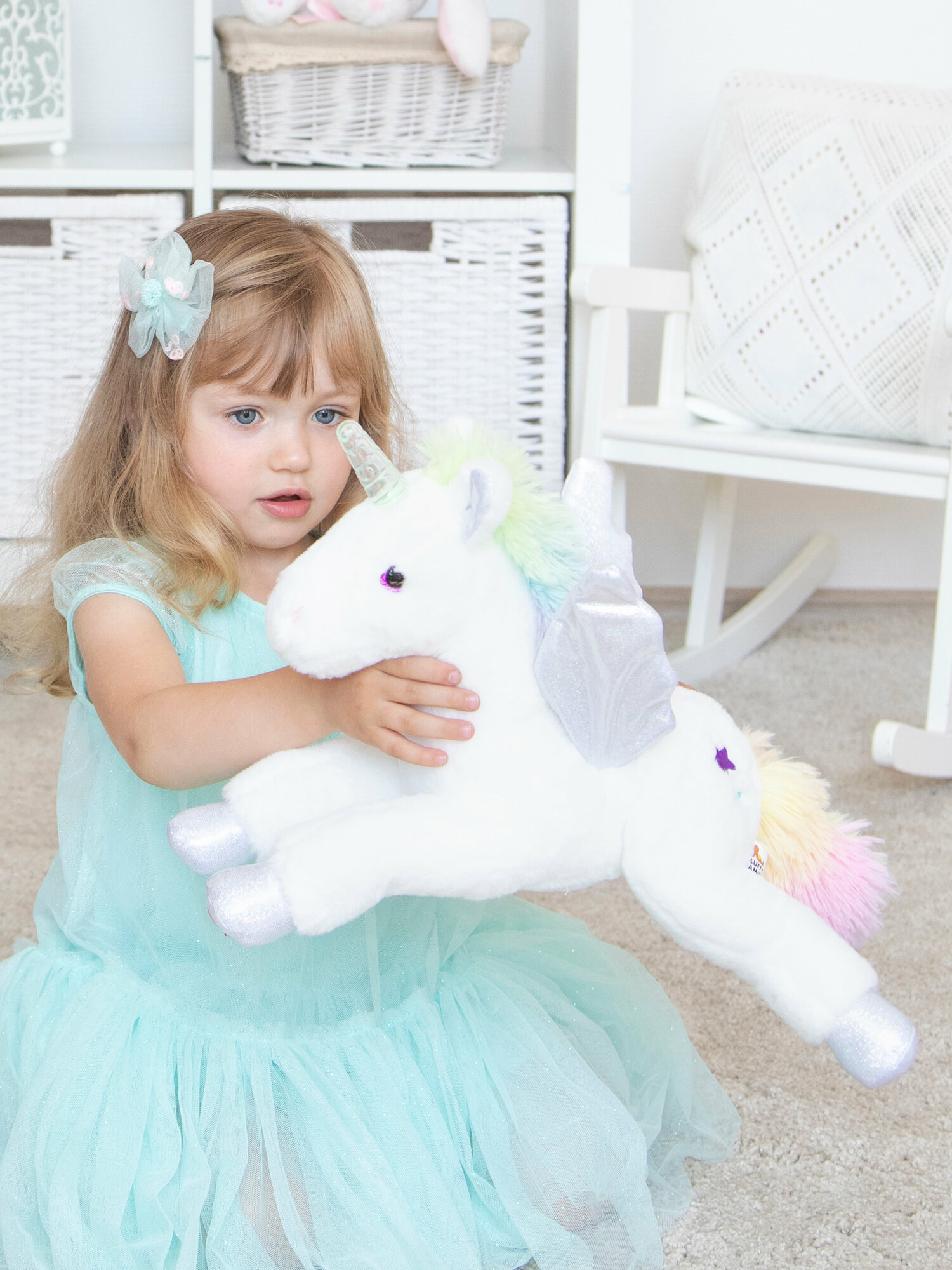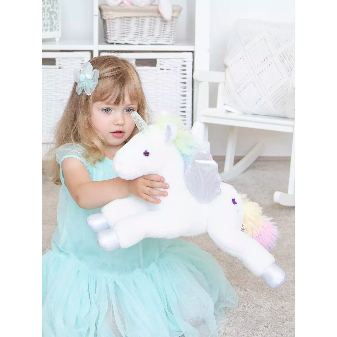 При включении игрушка забавно машет крылышками и проигрывает приятную мелодию, рог эффектно светится. Для того, чтобы активировать все эти функции, единорогу нужно нажать