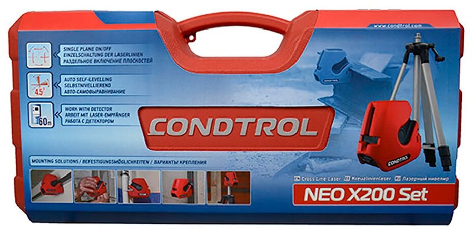 CONDTROL – специальный расширенный комплект Neo X200, который высоко оценят профессионалы.Лазерный нивелир Neo X200 это эргономичный, многофункциональный дизайн корпуса повышенной прочности, созданный для эксплуатации в суровых условиях стройплощадки, и обладающий высокой яркостью в рабочем диапазоне 30 м, а в импульсном режиме до 60 метров, даже в солнечную погоду.Полноценный штатив 5/8’’. В комплект входит штатив с элевационной головкой, благодаря чему максимальная его высота поднимается на высоту 130 см, что перекрывает основные потребности специалистов. Наличие профессиональной резьбы 5/8’’ обеспечивает надежное крепкое крепление к элевационной голове штатива.Различные варианты крепления. Для выполнения большего спектра задач, Neo X200 снабжен системой крепления корпуса, включающей клипсу для крепления на профиль, петлю для крепления на гвоздь и специальное сквозное плоское отверстием в корпусе нивелира под кабельную стяжку, с помощью которой его можно зафиксировать на вертикальных конструкциях: трубах системы отопления, стояках водоснабжения.Переходник с резьбы 5/8’’ на 1/4’’. Используя переходник Neo X200 может быть установлен как на фотоштатив, так и на аксессуары CONDTROL Krab и Wall Mount.