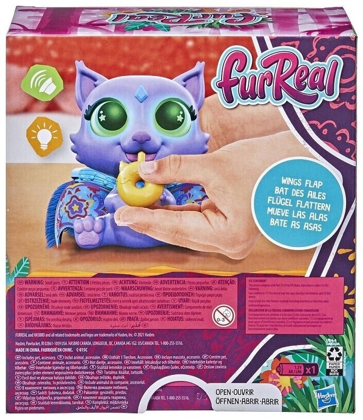 Угости фантастического зверька вкусняшкой или нажми на кнопку на спинке, чтобы он захлопал крылышками. Он отзовется забавными звуками и подсветкой. Если угощение слишком далеко, нажми на язычок питомца и посмотри, что будет. Позаботься о волшебном малыше, и вы станете лучшими друзьями!