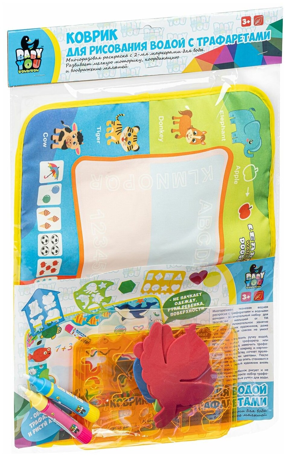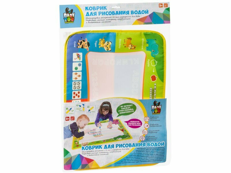 В составе набора: тканевый коврик для рисования 39х29 см, 2 трафарета (цифры и фигуры), 2 пластиковые ручки для воды, 8 шаблонов.