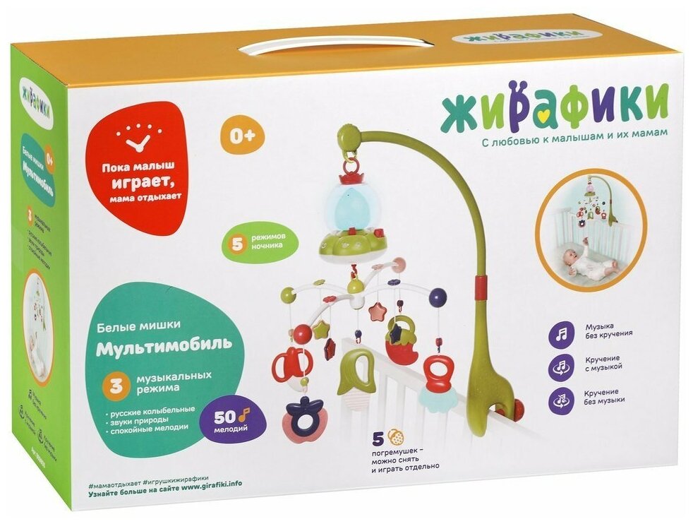 Мультифункциональный мобиль «Белые мишки» работает в 3-х музыкальных режимах: русские колыбельные, звуки природы и спокойные мелодии. К мобилю крепятся 5 красочных подвесных игрушек-погремушек, которые будут привлекать внимание малыша и побуждать его к двигательной активности. Сначала кроха будет с интересом разглядывать их, а затем начнёт тянуться к этим привлекательным игрушкам ручками и ножками, развивая таким образом хватательный рефлекс, моторику и внимание.