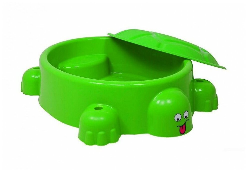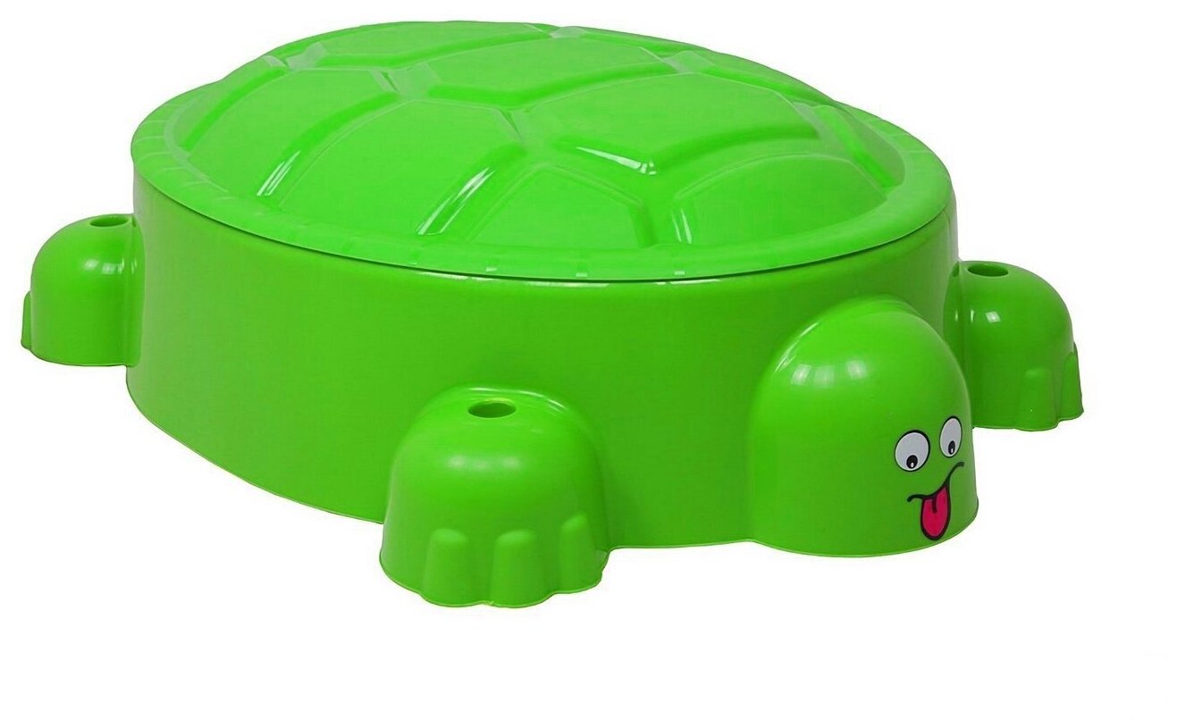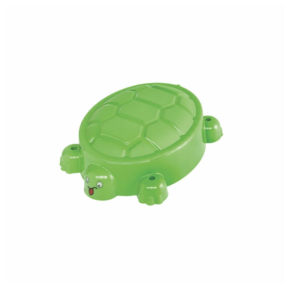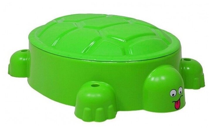 Детская песочница Paradiso Toys "Веселая Черепаха" с крышкой. Песочница-бассейн, выполненная в виде черепахи с фигурными лапками и головой, может быть наполнена и водой, и песком. Для удобства игры в ней предусмотрен выступ-сидение (в хвосте черепашки). Есть отверстия для солнцезащитного тента. В комплекте есть крышка в форме панциря.
