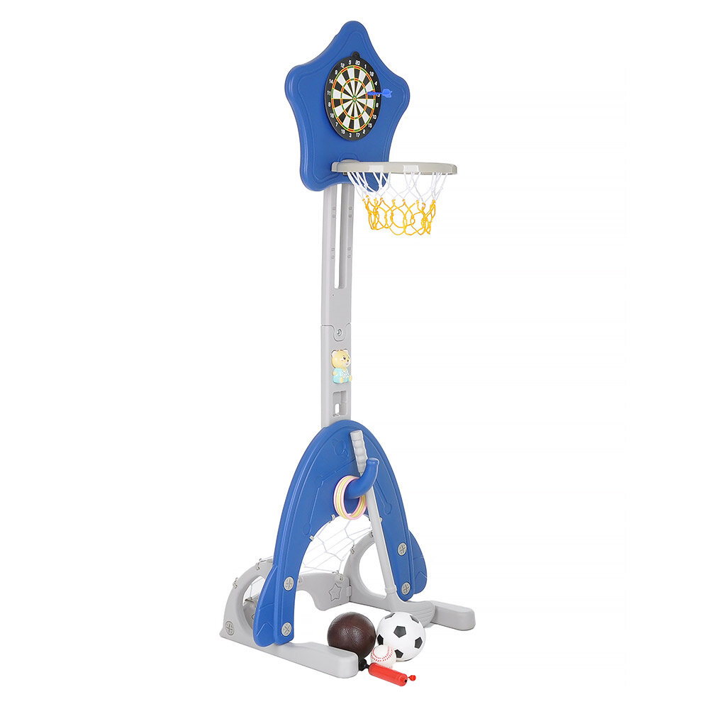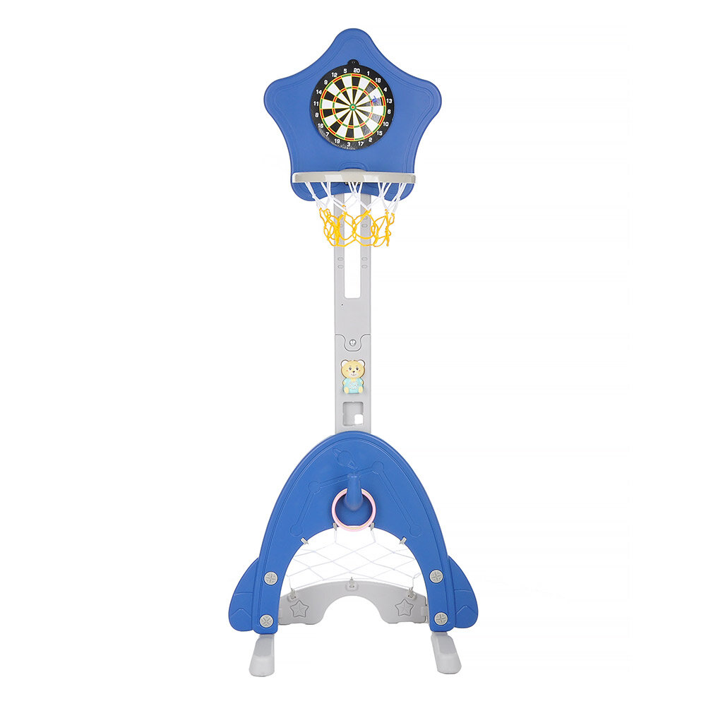 В комплект входят: мячи - 3 штуки (1-для гольфа, 1 (?15см)-для баскетбола,1 (?15см)-для футбола), клюшка для гольфа, кольца– 4 штуки, дартс (крепится на двусторонний скотч) +1 магнитный дротик, насос).