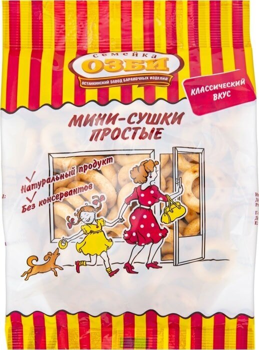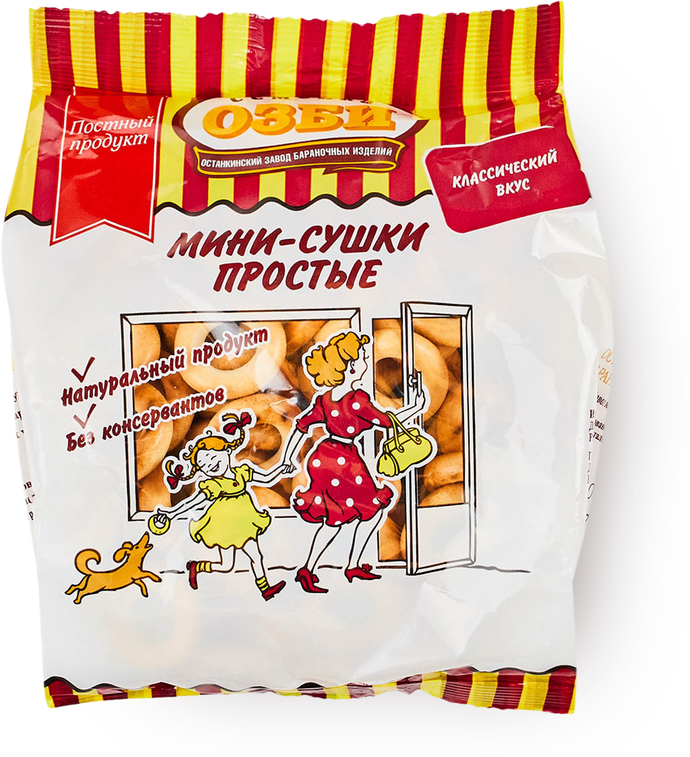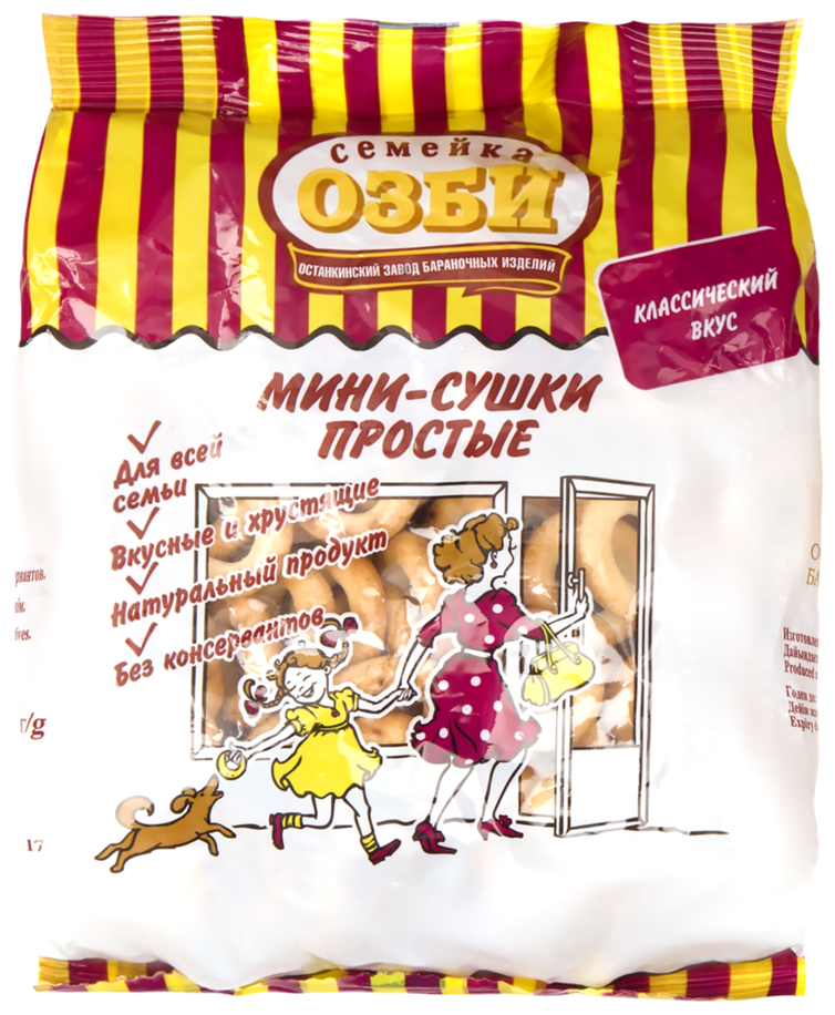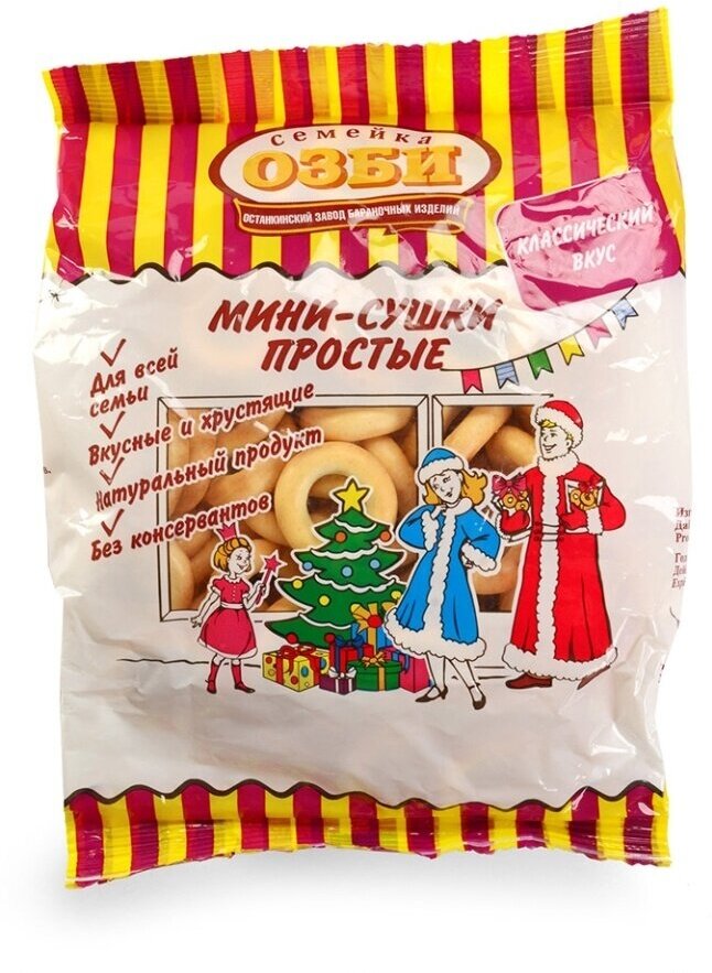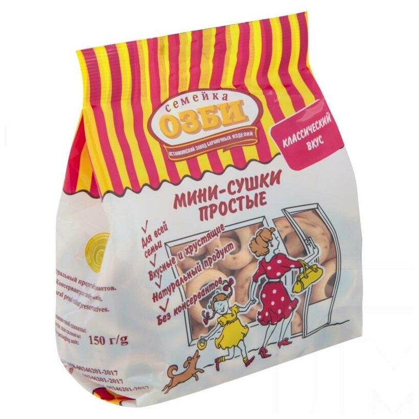 Нельзя представить себе традиционное русское чаепитие без сушек. Сушка – старинное славянское кулинарное изделие из теста. Сушки приобрели широкую популярность благодаря неприхотливости и способности подолгу и без потерь сохранять свои вкусовые, питательные и эстетические качества. Сушки "Семейка ОЗБИ" изготовлены классическим способом тестоприготовления с использованием опары и соблюдением всех необходимых технологических характеристик и параметров.