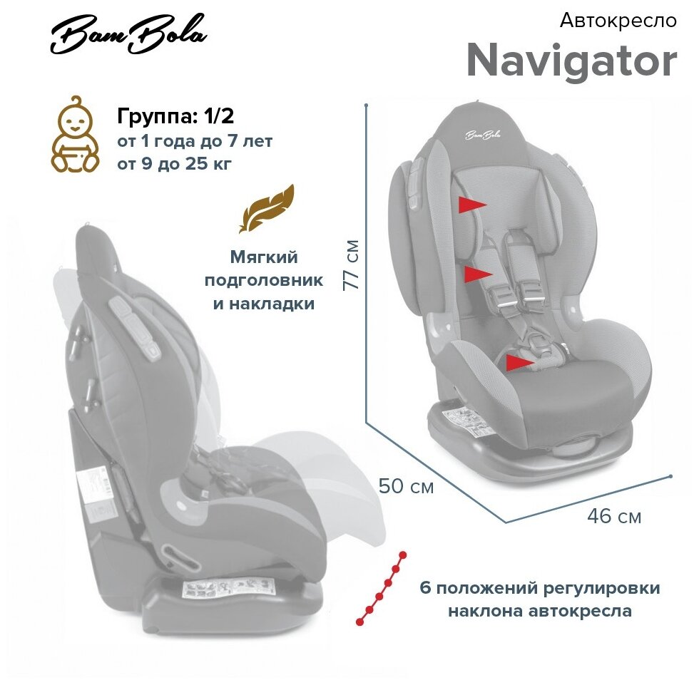 Детское автомобильное кресло Bambolo Navigator предназначено для детей от 1 года до 7 лет весом от 9 до 25 кг. Автокресло имеет выраженную тыльную и боковую защиту, что обеспечивает защиту ребенка при резких поворотах и боковых ударах. Замок внутренних ремней безопасности обладает повышенной надежностью, внутренние ремни регулируюся по высоте в зависимости от роста ребенка. Для детишек в возрасте от 1 до 4 лет можно регулировать наклон кресла в шести положениях.