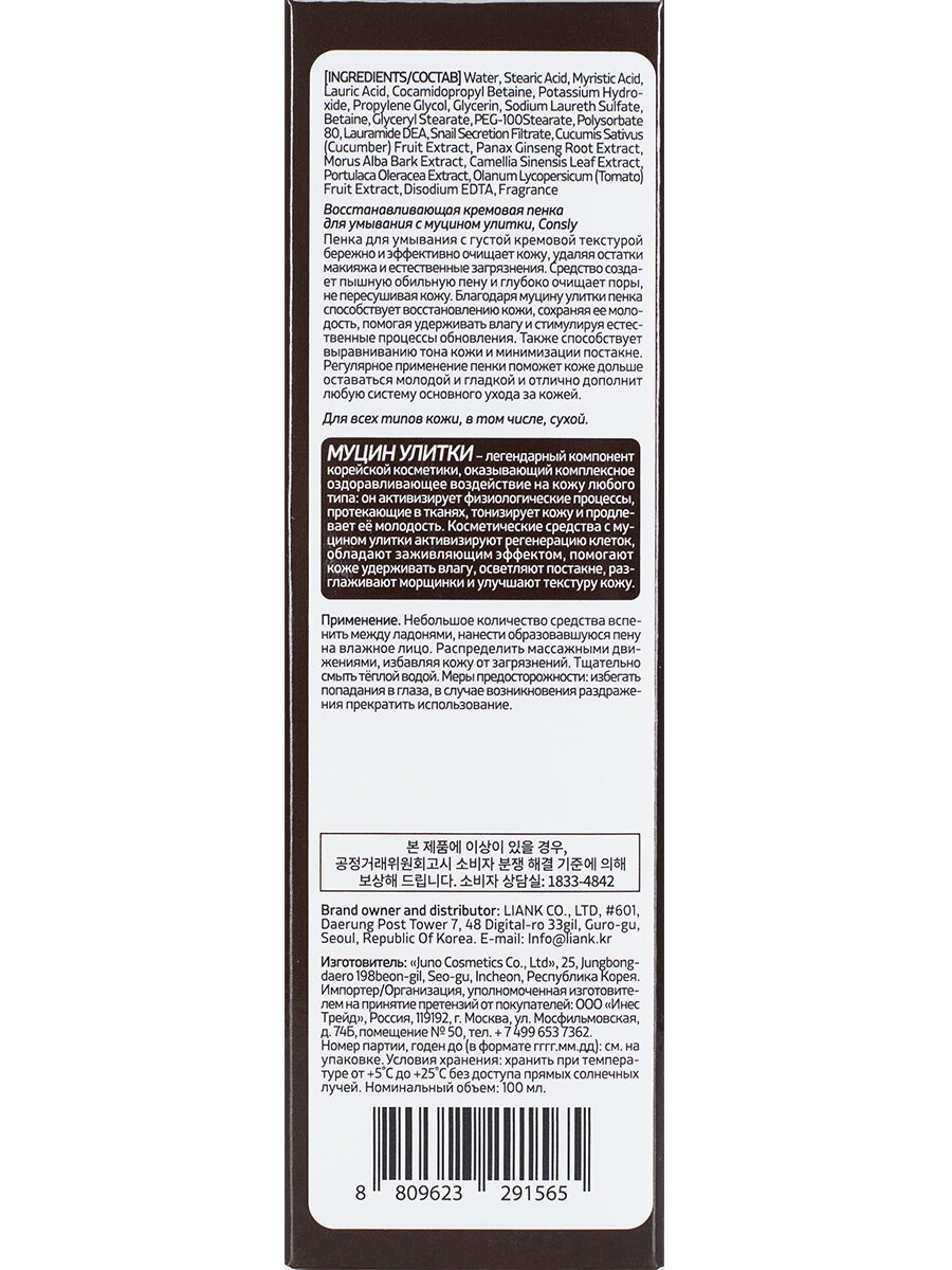 | Состав | Water, Stearic Acid, Myristic Acid, Lauric Acid, Cocamidopropyl Betaine, Potassium Hydroxide, Propylene Glycol, Glycerin, Sodium Laureth Sulfate, Betaine, Glyceryl Stearate, PEG-100Stearate, Polysorbate 80, Lauramide DEA, Snail Secretion Filtrate, Cucumber Fruit Extract, Panax Ginseng Root Extract, Morus Alba Bark Extract, Camellia Sinensis Leaf Extract, Portulaca Oleracea Extract, Tomato Fruit Extract, Disodium EDTA, Fragrance |