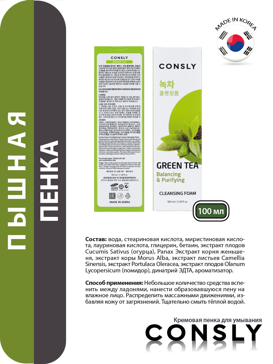 Балансирующая кремовая пенка Consly для умывания с экстрактом зеленого чая 100мл (291596)