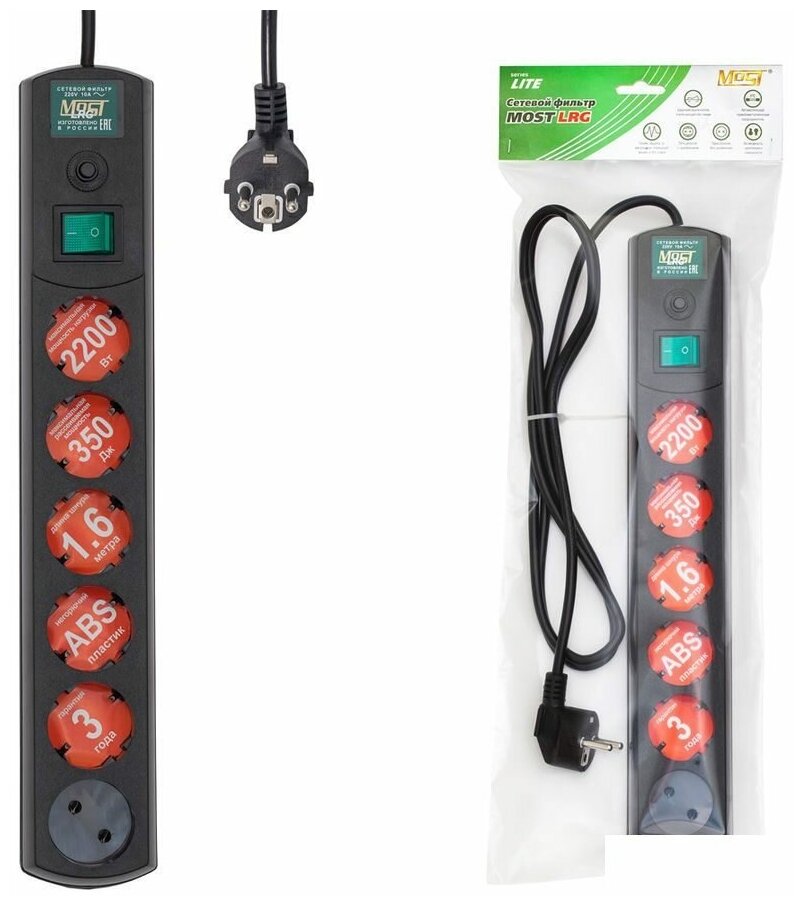 Сетевой фильтр MOST LRG защищает чувствительную электронику и другие приборы от высокочастотных помех и импульсных перегрузок. В нем предусмотрено пять розеток Schuko с системой заземления и одно гнездо российского стандарта. Встроенный термический предохранитель автоматически отключает приборы при перегрузке, предотвращая возникновение пожара или поломку дорогостоящего оборудования.