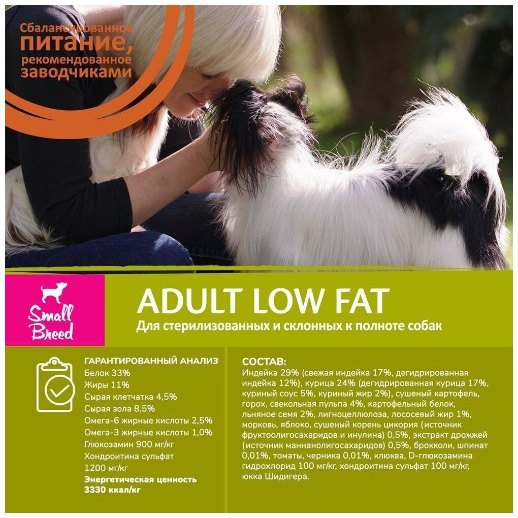 | Особенности | Индейка 32% (свежая индейка 16%, дегидрированная индейка 16%), курица 30%(дегидрированная курица 16%, куриный жир 8%, куриный соус 6%), горох 20%, картофельный белок, свекольная пульпа 4%, льняное семя 3%, сушеный картофель, лососевый жир 1%, лигноцеллюлоза, морковь, яблоко, экстракт дрожжей (источник маннанолигосахаридов) 0,5%, сушеный корень цикория (источник фруктоолигосахаридов и инулина) 0,5%, брокколи, шпинат, томаты, черника, клюква 0,01%, сушеная мята, D-глюкозамин гидрохлорид 100 мг/к |