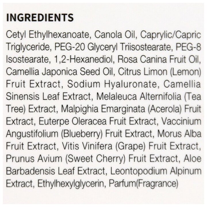 | Состав | cetyl ethylhexanoate; canola oil; caprylic/capric triglyceride; peg-20 glyceryl triisostearate; peg-8 isostearate; rosa canina fruit oil; camellia japonica seed oil; camellia sinensis leaf extract; melaleuca alternifolia (tea tree) extract; sodium hyaluronate; citrus medica limonum (lemon) fruit water; malpighia emarginata (acerola) fruit extract; euterpe oleracea fruit extract; vaccinium angustifolium (blueberry) fruit extract; morus alba fruit extract; vitis vinifera (grape) fruit extract; prunus avium (sweet cherry) fruit extract; aloe barbadensis leaf extract; leontopodium alpinum extract; phenoxyethanol; parfum |