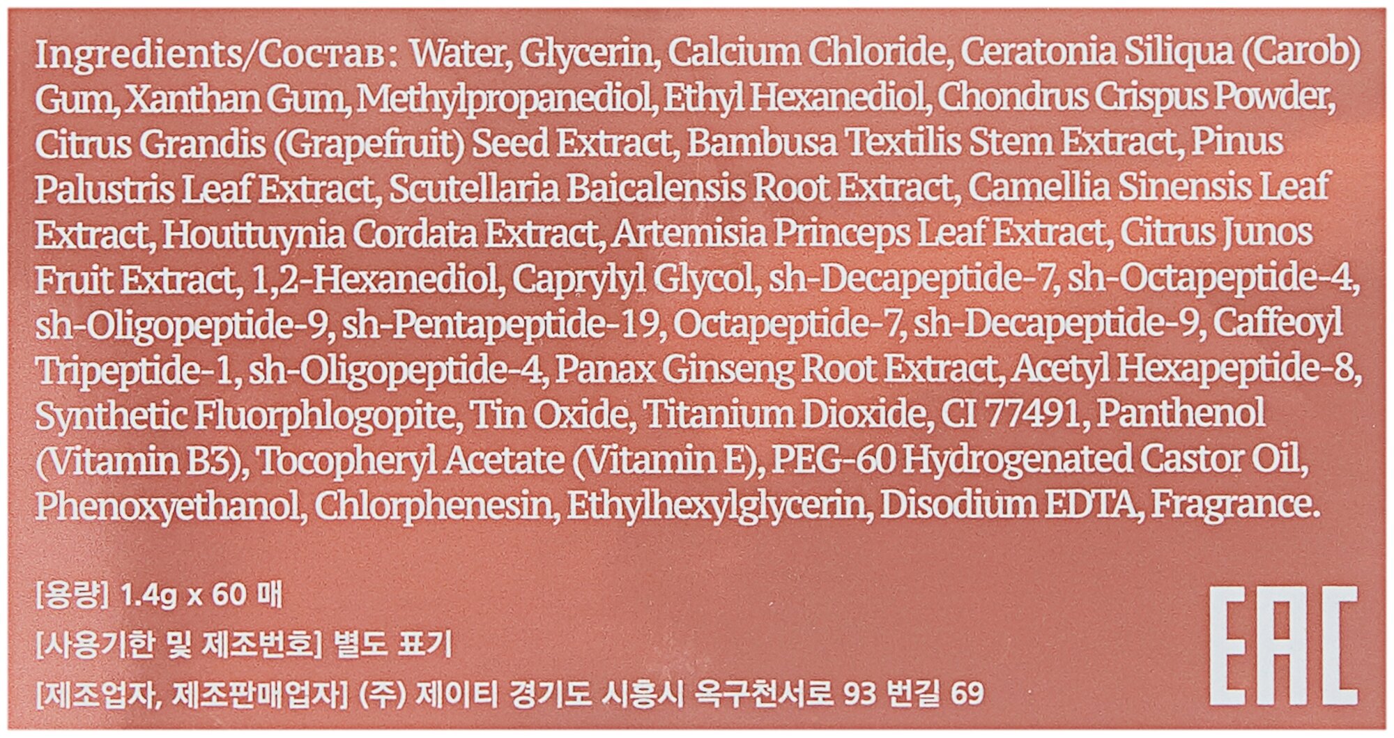 | Состав | water, glycerin, calcium chloride, ceratonia siliqua (carob) gum, xanthan gum, methylpropanediol, ethyl hexanediol, chondrus crispus powder, citrus grandis (grapefruit) seed extract, bambusa textilis stem extract, pinus palustris leaf extract, scutellaria baicalensis root extract, camellia sinensis leaf extract, houttuynia cordata extract, artemisia princeps leaf extract, citrus junos fruit extract, 1,2-hexanediol, caprylyl glycol, sh-decapeptide-7, sh-octapeptide-4, sh-oligopeptide-9, sh-pentapeptide-19, octapeptide-7, sh-decapeptide-9, caffeoyl tripeptide-, sh-oligopeptide-4, panax ginseng root extract, acetyl hexapeptide-8, synthetic fluorphlogopite, tin oxide, titanium dioxide, ci 77491, panthenol (vitamin b3), tocopheryl acetate (vitamin e), peg-60 hydrogenated castor oil, phenoxyethanol, chlorphenesin, ethylhexylglycerin, disodium edta, fragrance |