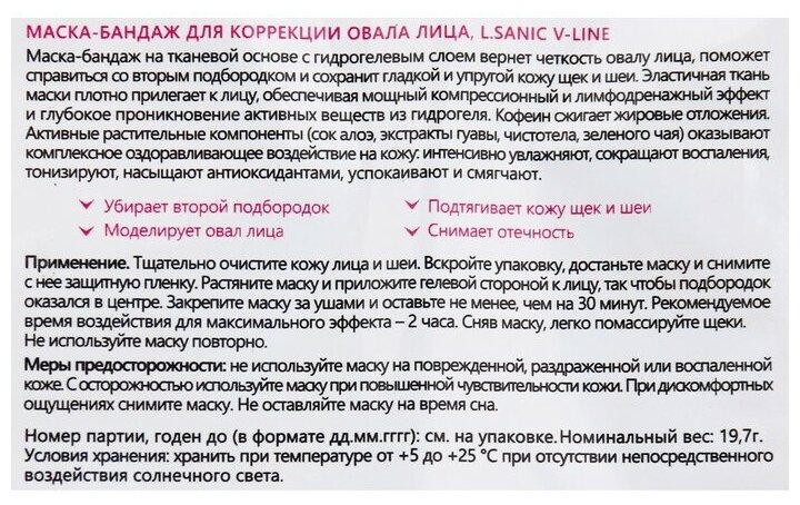 Маска-бандаж на тканевой основе с гидрогелевым слоем вернет четкость овалу лица, поможет справиться со вторым подбородком и сохранит гладкой и упругой кожу щек и шеи. Эластичная ткань маски плотно прилегает к лицу, обеспечивая мощный компрессионный и лимфодренажный эффект и глубокое проникновение активных веществ из гидрогеля. Кофеин сжигает жировые отложения. Активные растительные компоненты (сок алоэ, экстракты гуавы, чистотела, зеленого чая) оказывают комплексное оздоравливающее воздействие на кожу: инте