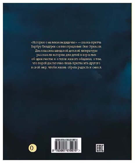 «История о маленьком дядечке» — притча-сказка Барбру Линдгрен с иллюстрациями Эвы Эриксон. Два классика шведской детской литературы рассказали историю для детей и взрослых об одиночестве и тепле живого общения, о том, что порой достаточно лишь пригласить другого в свой мир, чтобы жизнь обрела радость и смысл.