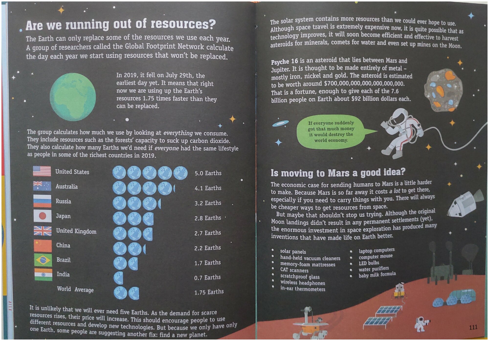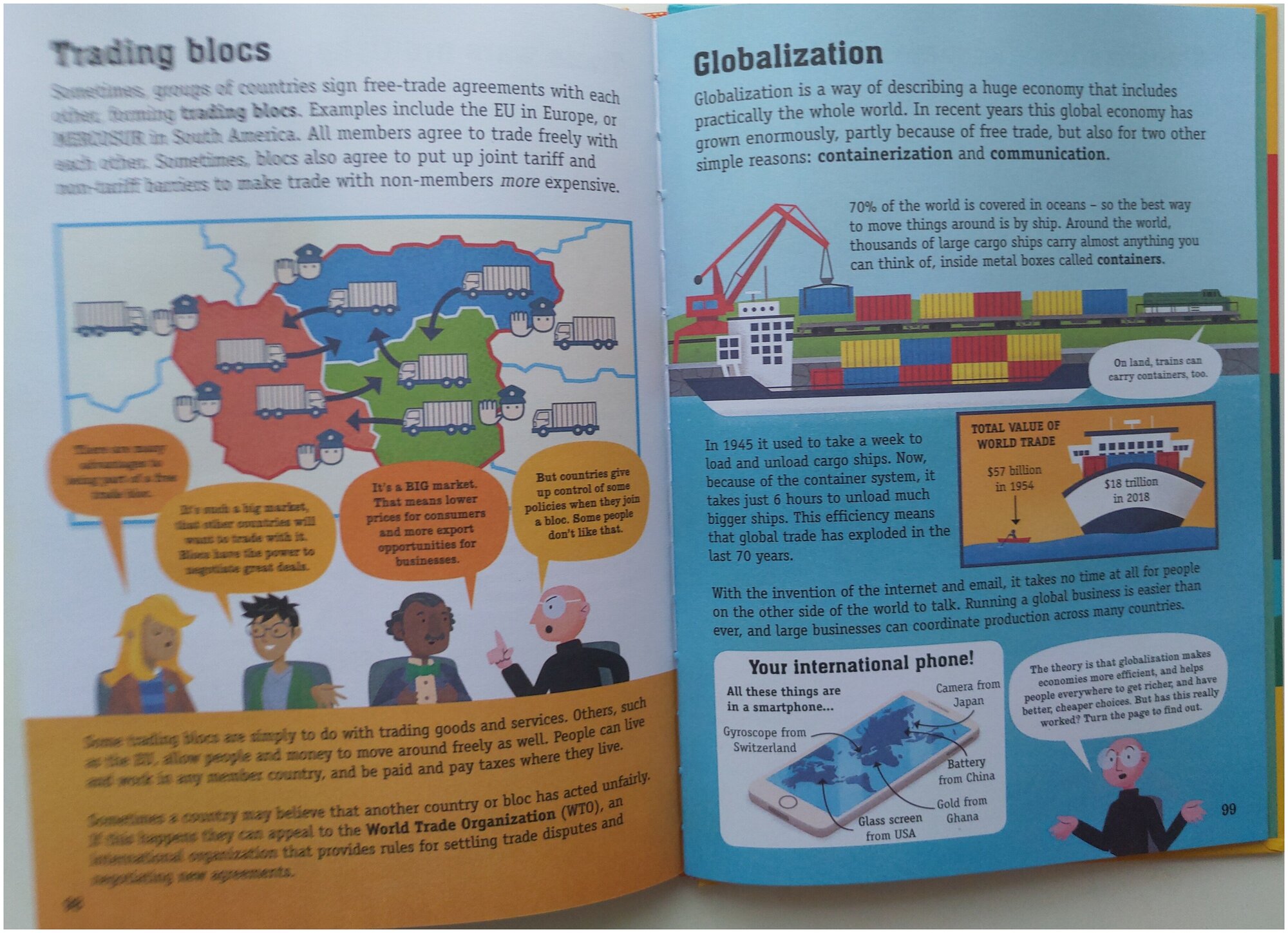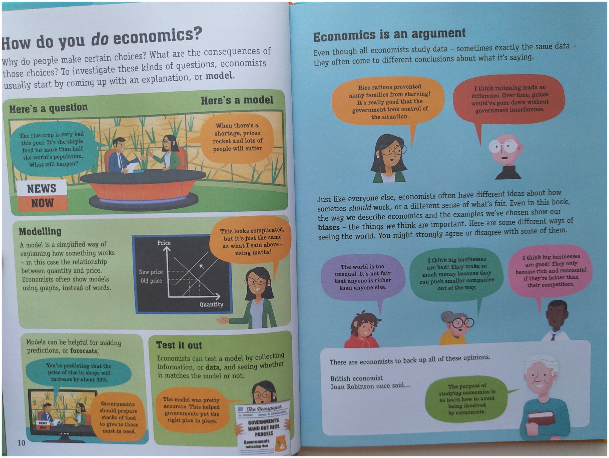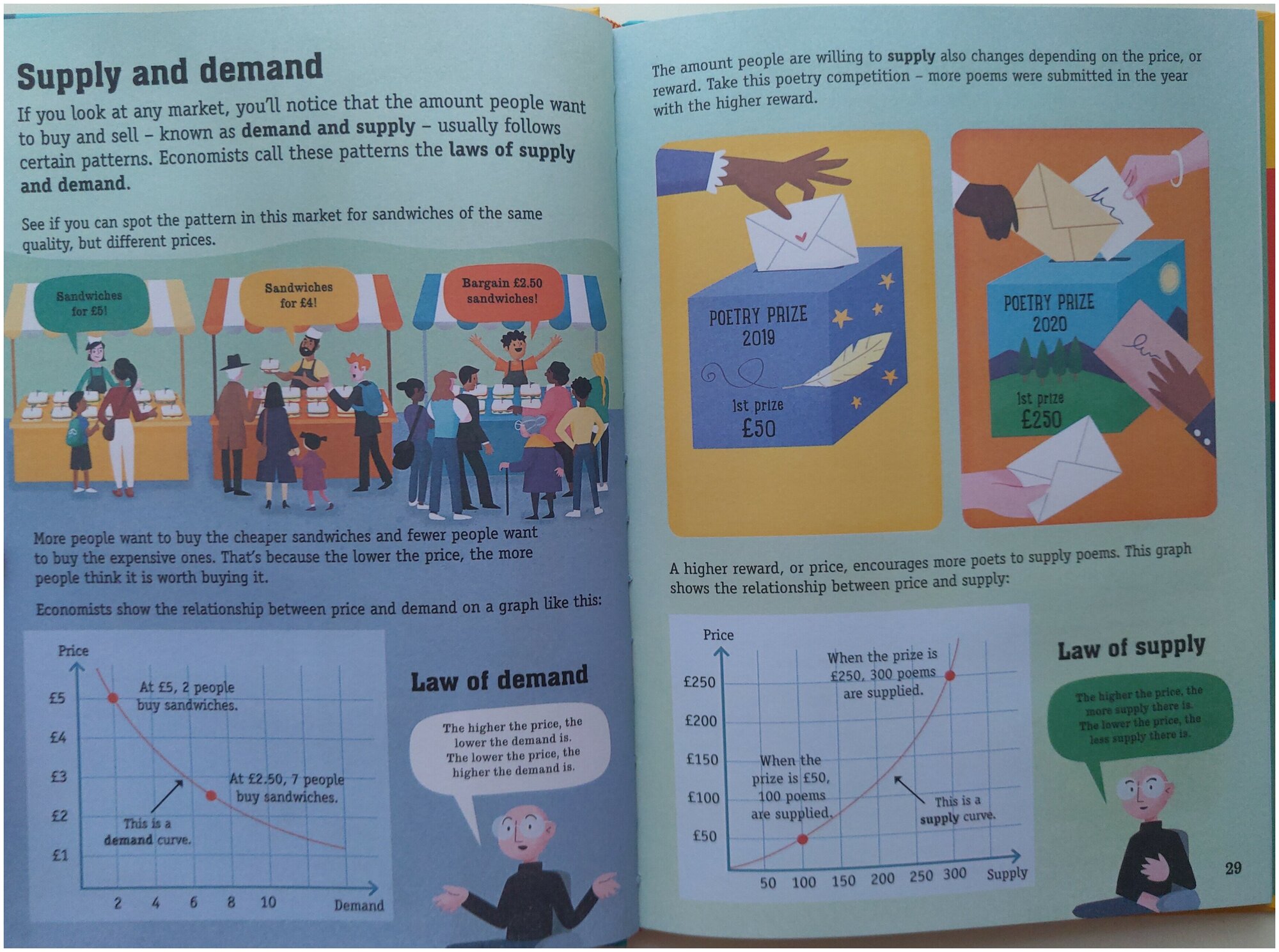 Очень подробная и ясная (понятная и связно изложенная) книжка, также содержит отличные изображения и примеры, помогающие объяснить вещи. Редкость среди хорошего научпопа для детей. Ну и я благодаря ней теперь много нового знаю об основах экономики! Казалось бы, элементарные вещи, но как они работают точно большинство взрослых не знают.