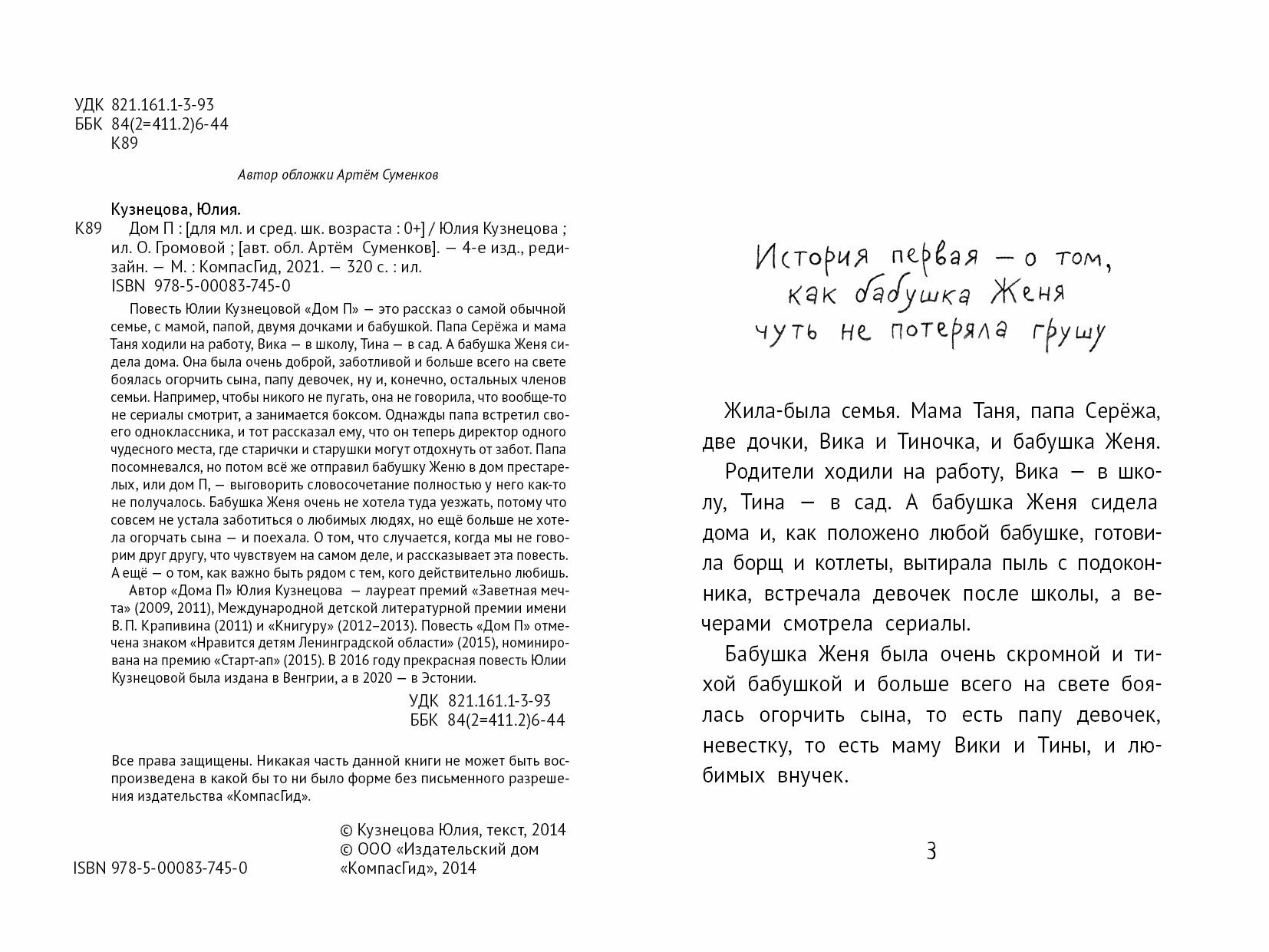 Повесть Юлии Кузнецовой «Дом П» - это рассказ о самой обычной семье, с мамой, папой, двумя дочками и бабушкой. Папа Сережа и мама Таня ходили на работу, Вика - в школу, Тина - в сад. А бабушка Женя сидела дома. Она была очень доброй, заботливой и больше всего на свете боялась огорчить сына, папу девочек, ну и, конечно, остальных членов семьи. Например, чтобы никого не пугать, она не говорила, что вообще-то не сериалы смотрит, а занимается боксом. Однажды папа встретил своего одноклассника, и тот рассказал ему, что он теперь директор одного чудесного места, где старички и старушки могут отдохнуть от забот. Папа посомневался, но потом все же отправил бабушку Женю в дом престарелых, или Дом П, - выговорить словосочетание полностью у него как-то не получалось. Бабушка Женя очень не хотела туда уезжать, потому что совсем не устала заботиться о любимых людях, но еще больше не хотела огорчать сына - и поехала. О том, что случается, когда мы не говорим друг другу, что чувствуем на самом деле, и рассказывает эта повесть. А еще - о том, как важно быть рядом с тем, кого действительно любишь. Автор повести «Дом П» Юлия Кузнецова - лауреат премий «Заветная мечта» (2009, 2011), Международной детской литературной премии имени В. П. Крапивина (2011) и «Книгуру» (2012-2013).Для младшего и среднего школьного возраста.