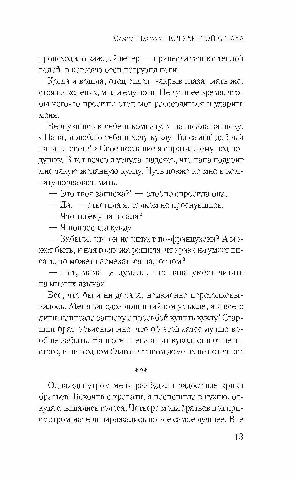 Важная книга о том, что на самом деле происходит под вывеской "традиционных ценностей" и семейного консерватизма. Книга поразила в самое сердце. История, расказанная Самией Шарифф — всего лишь кирпичик в огромной стене фундаментализма, нескончаемого насилия, где женщина принуждена быть молчаливым и послушным существом, едва ли заслуживающим человеческих прав. Советую прочитать всем — эта история реальна, а автор дает голос тем, кто навсегда его лишен. Это очень важно.