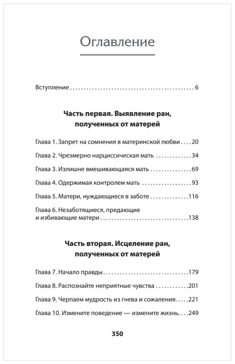 В книге описаны нарциссическая мать, мать-соперница, мать, помешанная на контроле, мать, запутавшаяся в жизни, матери, которые не защищают дочерей от насилия или сами агрессивны к своим дочерям.