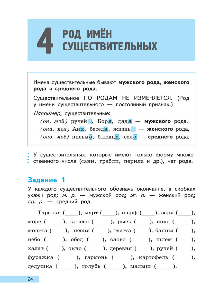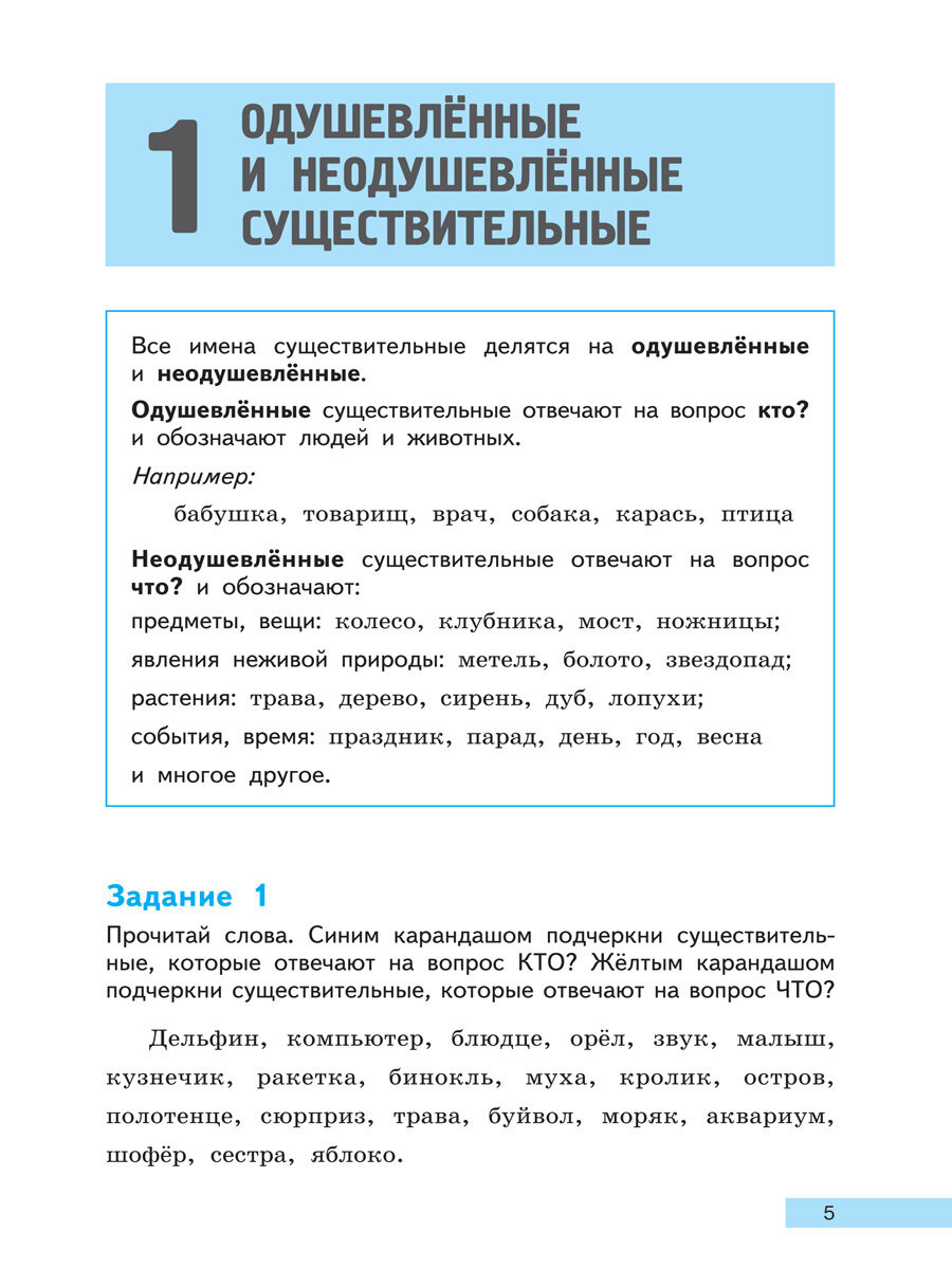 Пособие содержит систему заданий, которые позволят сформировать у школьника устойчивые грамматические и орфографические умения и навыки, связанные с усвоением материала об имени существительном. Включает краткие теоретические сведения о существительном, которые изучаются во 2-4 классах. Раздел с ответами предназначен для педагогов и родителей и позволит им проверить выполнение заданий школьниками.