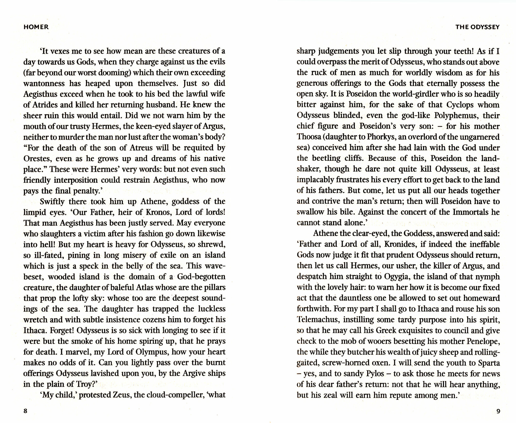 Сейчас я и не вспомню как эта книга попала ко мне в руки. Знаю что после первого прочтения эта история мне очень понравилась. Эпическое сказание, которому уже почти три тысячи лет. Книга увлекала меня постепенно. Спокойное течение событий переплеталось с драматическими сражениями, личные переживания героя с проблемами общества. Боги и герои, короли и королевы, нимфы и циклопы, множество хитросплетений судьбы и даже город, полный злосчастных женихов, - чего еще желать от древней легенды?