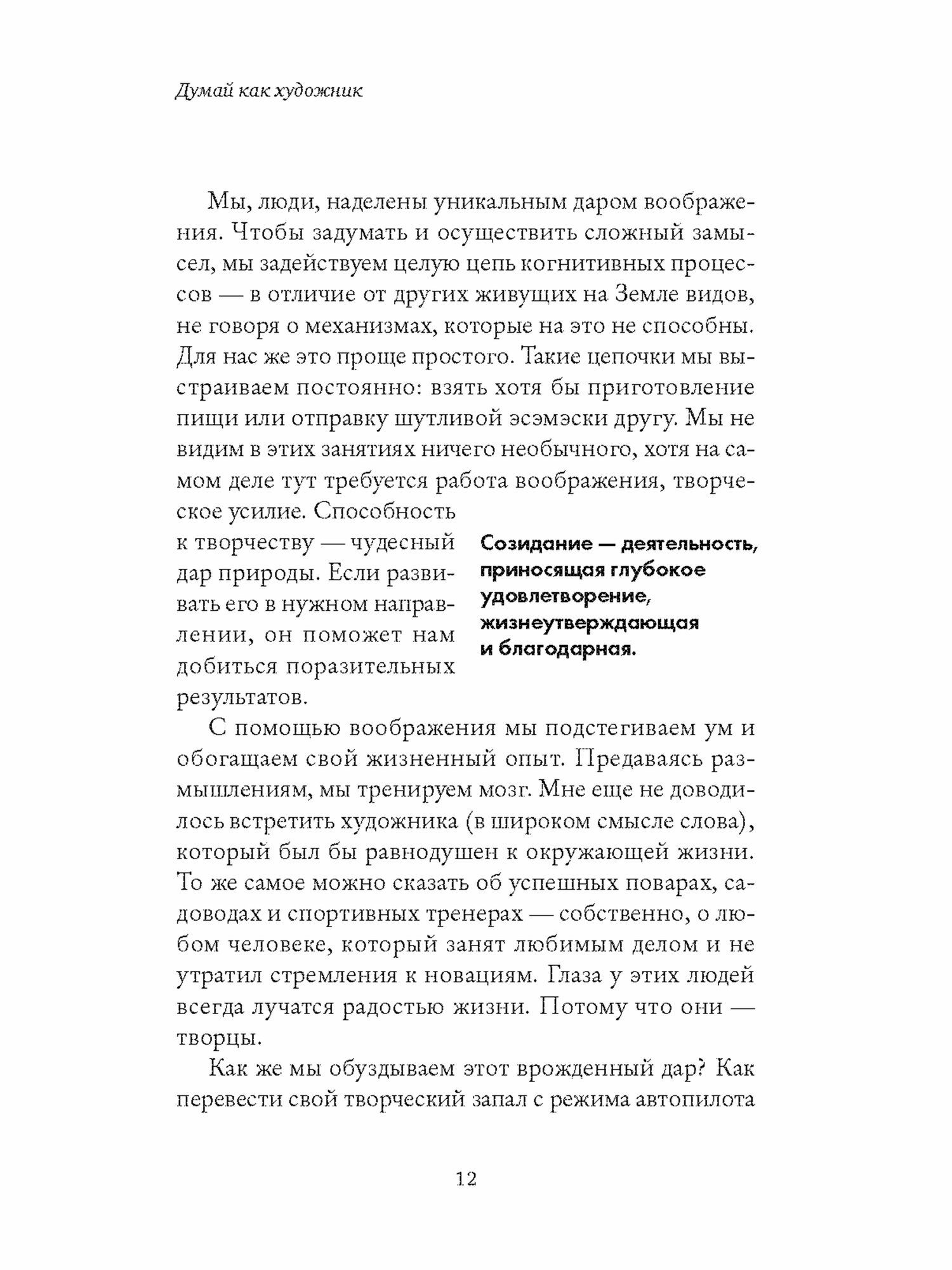 Каждый из нас может стать творцом в какой-либо сфере - считает Уилл Гомперц, редактор отдела искусства Би-би-си, бывший директор галереи Тейт, автор всемирного бестселлера "Непонятное искусство". Хорошо знакомый со многими выдающимися деятелями современного искусства и много лет посвятивший изучению их творчества, в своей новой книге он знакомит читателей с подходами, практиками и приемами, с помощью которых творческие личности настраивают свое воображение на поиск новых идей и превращают его в эффективный инструмент. Уилл Гомперц уверен: взяв их на вооружение, практически каждый может разбудить дремлющий в нем творческий дар и сделать свою жизнь более креативной и плодотворной.